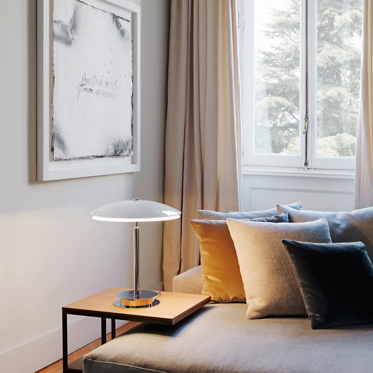 Das Gestell der Fontana Arte Tris Tischleuchte ist aus verchromtem Metall gefertigt, dessen glanzvolle Oberfläche in harmonischem Einklang zum weißem Glas des Leuchtenschirms steht. Der Diffusor selbst ist das reizvollste Element der Tris Tischlampe. Er setzt sich aus zwei dünnwandigen, übereinandergelagerten Glasschalen zusammen. Während die untere Schale aus sandgestrahltem Glas besteht, ist die obere an ihrer Innenseite weiß lackiert.
