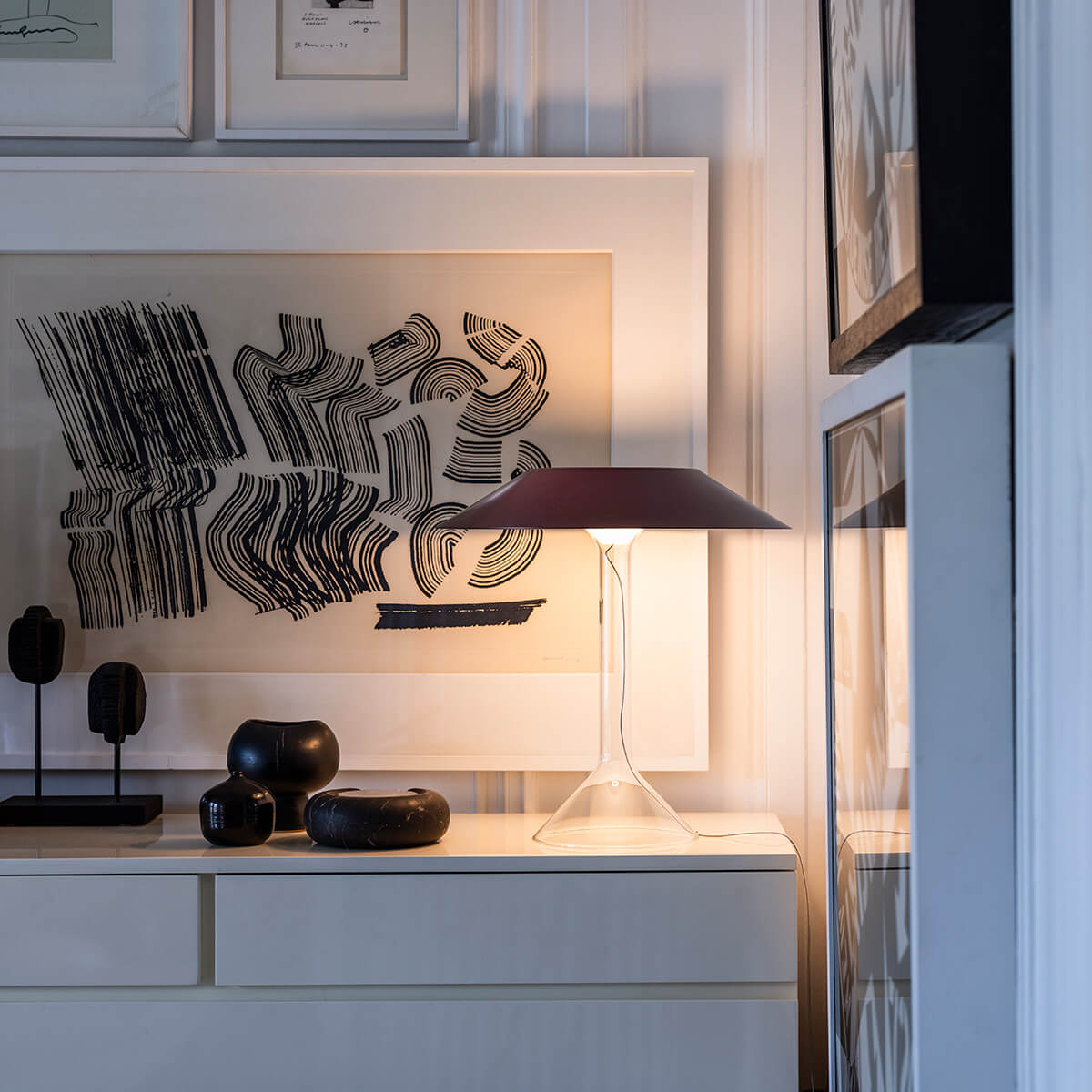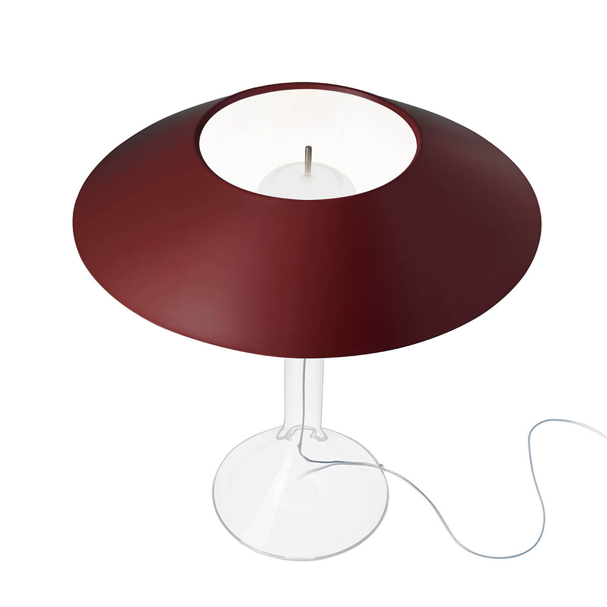 Erhältlich ist der Schirm in edlem Dunkelrot. Die Transparenz des Sockels verstärkt den Zauber der Chapeaux M Tischlampe: Im ausgeschalteten Zustand verschwindet der gläserne Körper beinahe aus dem Blickfeld, um bei eingeschaltetem Licht diskret sichtbar zu werden. Ein elegantes Detail ist das transparente Stromkabel, das sich sanft durch den Fuß zieht und durch eine spezielle Öffnung hervortritt.