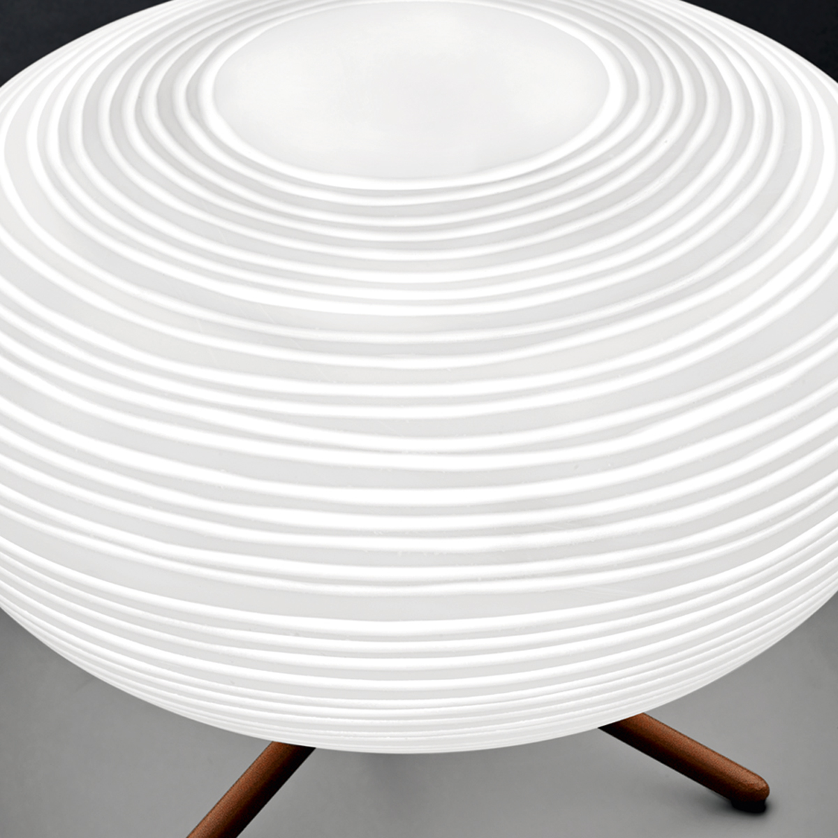Horizontale Furchen, welche die Oberfläche der Leuchten zieren, lassen ein weiches und faszinierendes Dekor entstehen und tragen dazu bei, ein warmes und volles Licht zu erzeugen. Die Bearbeitung des Glases, der besondere Schleifeffekt, erschafft hierbei je nach Tiefe der Einschnitte neuartige Hell-Dunkel-Effekte. Als Basis dient einer jeden Foscarini Rituals Tavolo Tischleuchte ein dreibeiniges Untergestell aus lackiertem Metall.