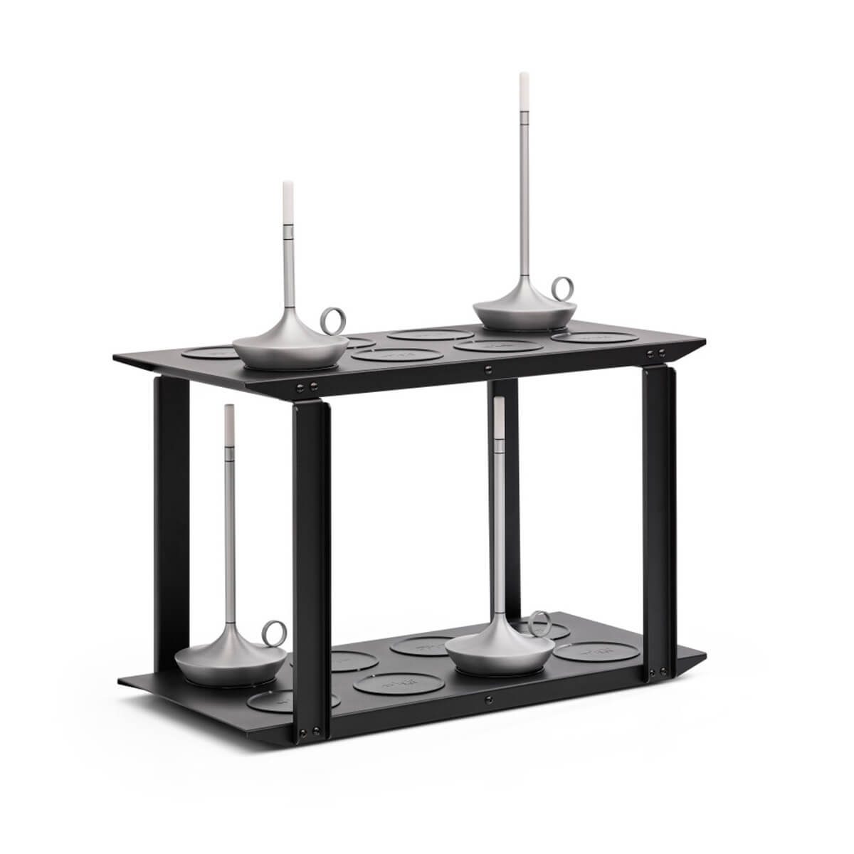 Jedes Charging Tray kann bis zu acht Wick PRO Leuchten pro Ebene laden. Erhältlich sind Ausführungen als Single Tray mit acht Ladepunkten, als 2-stöckige Ladestation für 16 Lampen sowie als 3-stöckige Variante für bis zu 24 Akku-Tischleuchten. Die einzelnen Ladeplattformen werden über passende Beine und Verbindungskabel miteinander kombiniert. Dadurch entsteht ein skalierbares Ladesystem, das sich optimal an die Größe Ihres Projekts anpassen lässt.