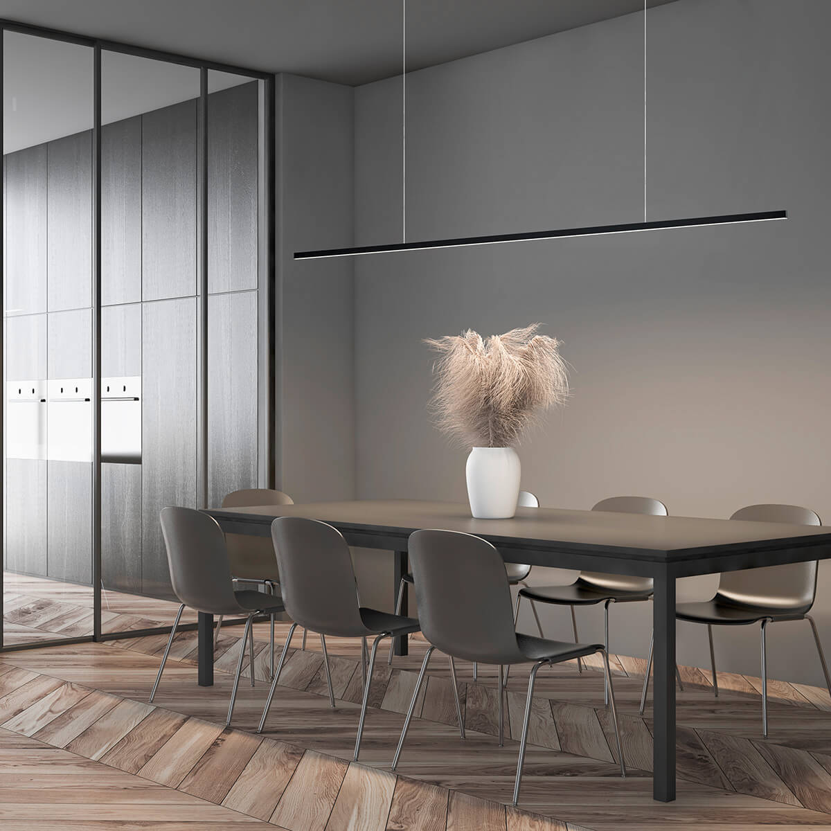 Der filigrane Korpus aus mattiertem Aluminium in Gold oder Schwarz verleiht der Designer-Pendellampe eine fast schwerelose Anmutung. Über dem Esstisch oder in modernen Wohnküchen sorgt die Lampe für ein stilvolles Ambiente, das Designliebhaber begeistert.