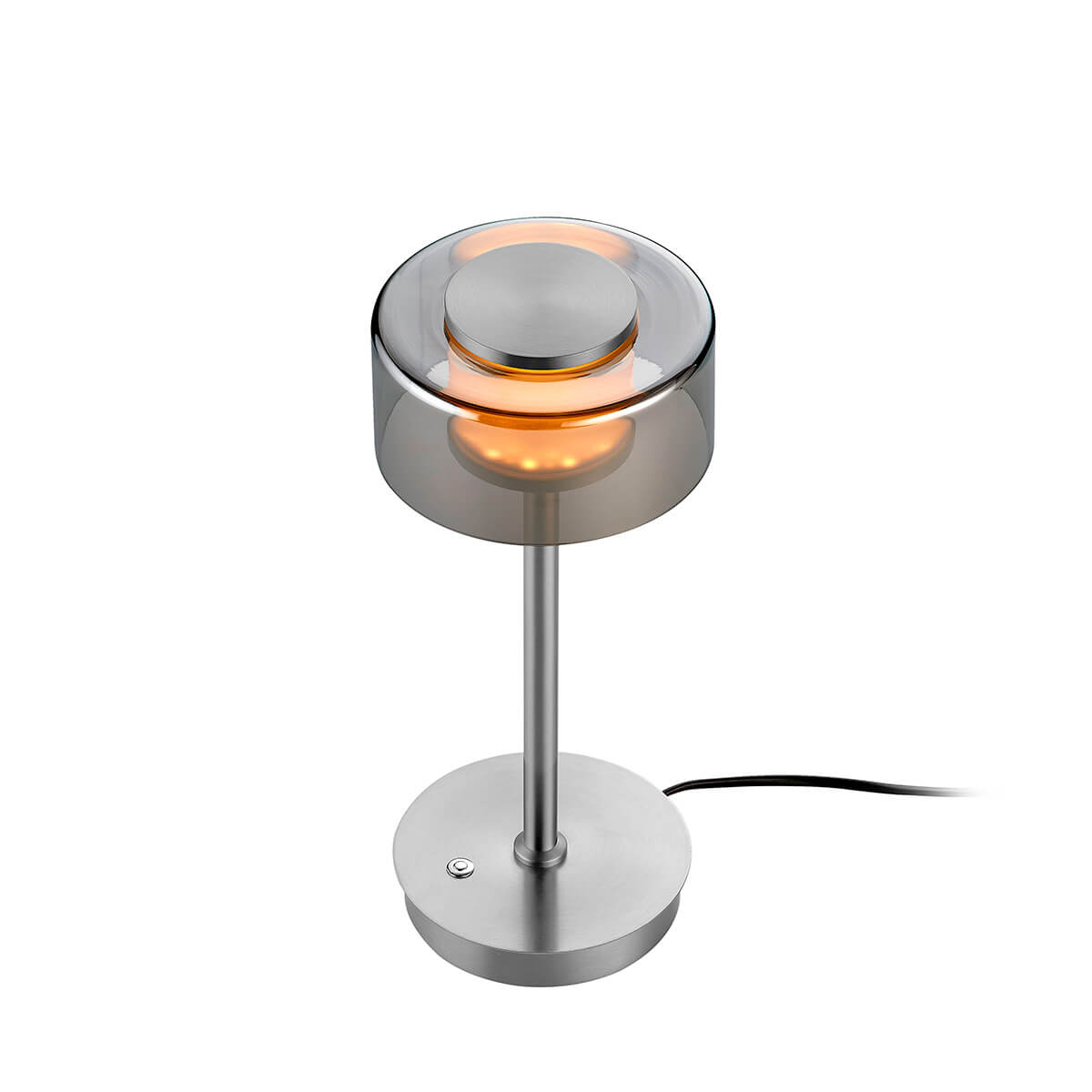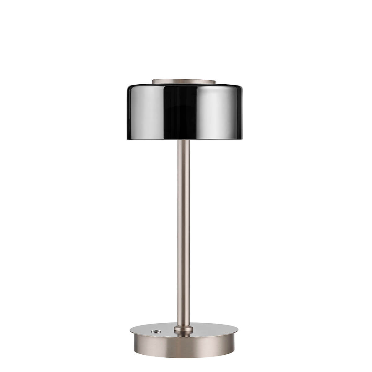 Optisch überzeugt die Lampe durch ihren edlen Materialmix: Der schlanke Korpus aus mattiertem Nickel wird durch glänzende Chromdetails ergänzt und bildet einen stilvollen Kontrast zum rauchfarben getönten Glasschirm. Das Ergebnis ist eine modern-elegante Tischlampe, die sich sowohl in klassische als auch zeitgemäße Interieurs harmonisch einfügt.