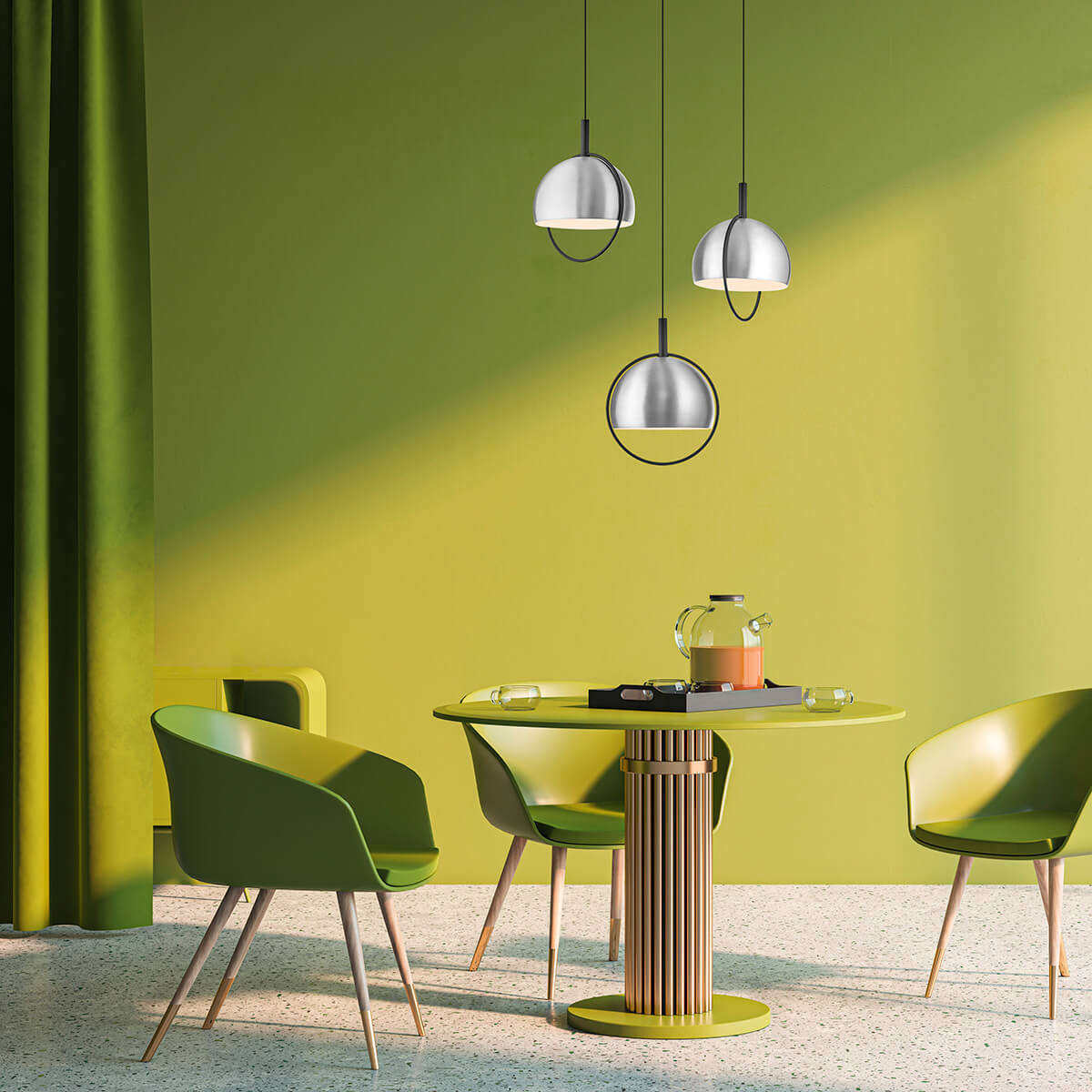Die Hoop LED Pendelleuchte mit Rondell von HELL setzt ein klares Designstatement über runden Tischflächen. Drei kugelförmige Schirme, jeweils von einem charakteristischen Bügel umrahmt, hängen an einem zentralen Deckenrondell und schaffen eine ausgewogene, symmetrische Lichtwirkung. Das Ergebnis ist eine moderne Pendellampe, die Leichtigkeit und grafische Präsenz harmonisch vereint – ideal für Küche und Esszimmer zu Hause.