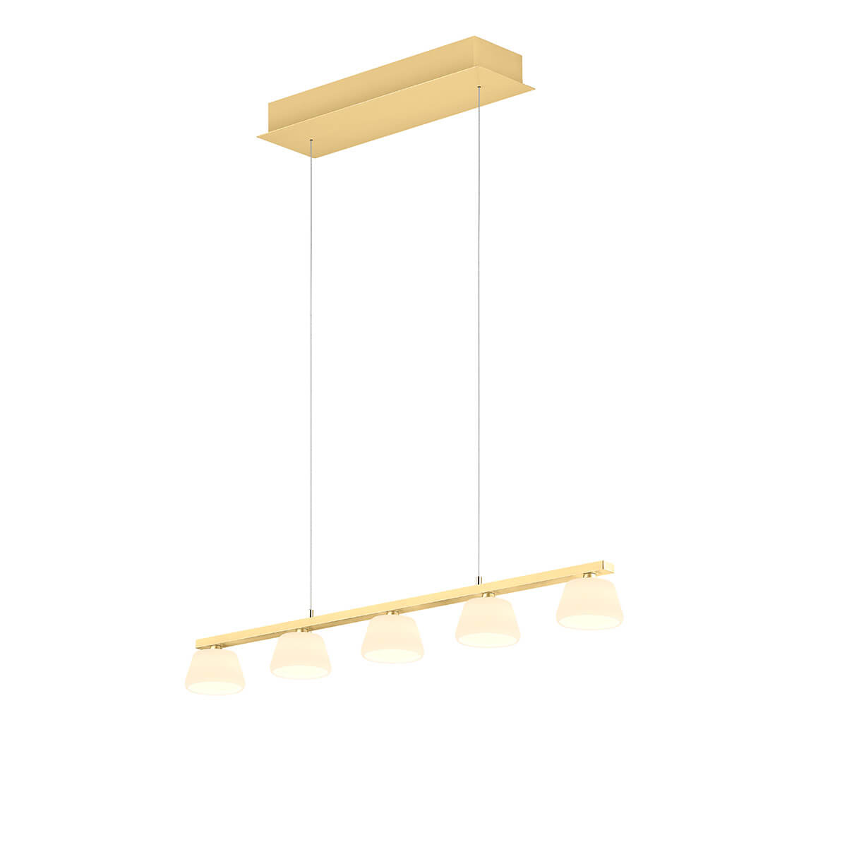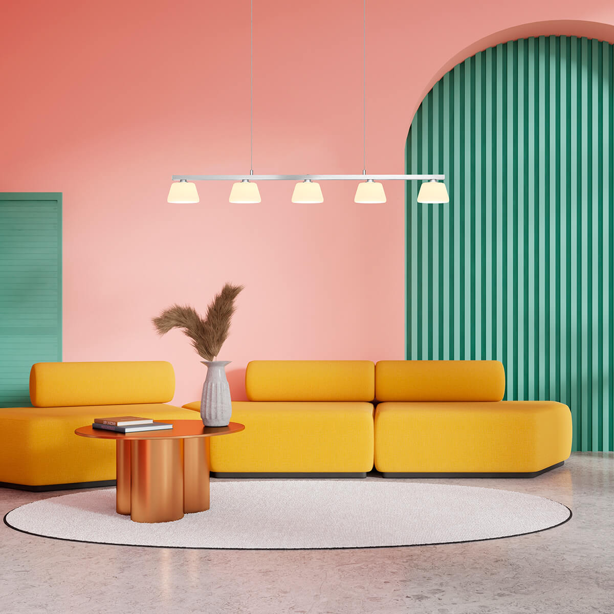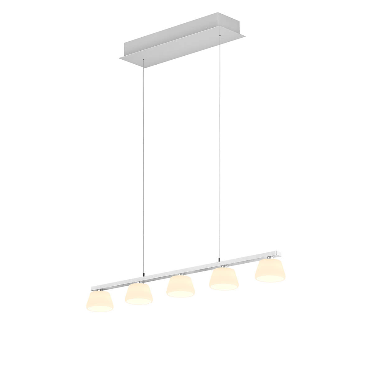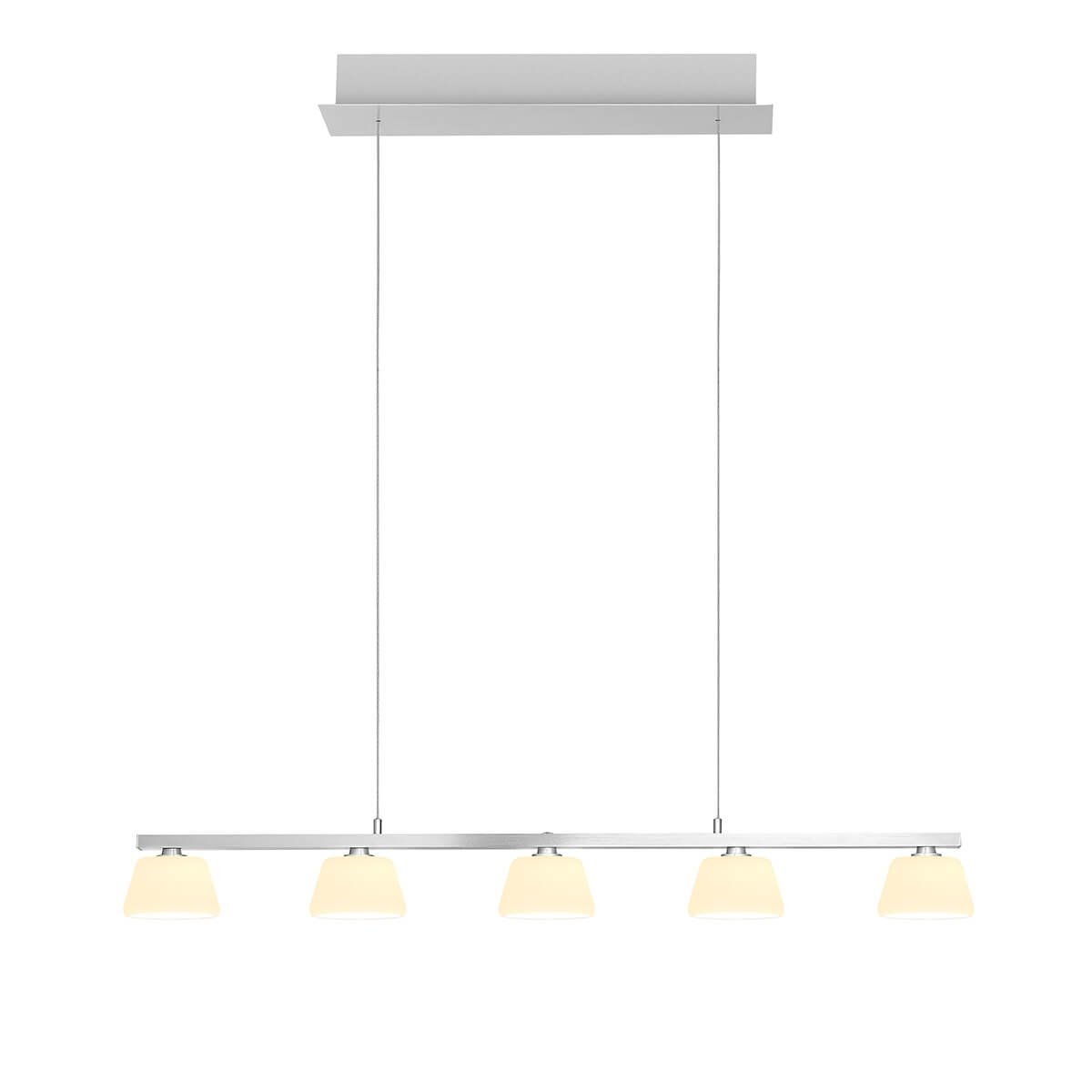 Die 5-flammige Jane LED Pendellampe von HELL verbindet ein elegantes Design mit moderner Lichttechnik und ist die ideale Wahl für stilvoll beleuchtete Esstische. Mit ihrer schlanken Balkenform und den fünf opalweißen Glasschirmen setzt sie edle Akzente über Tischen in Küche oder Esszimmer und sorgt zugleich für eine gleichmäßige, angenehme Ausleuchtung.