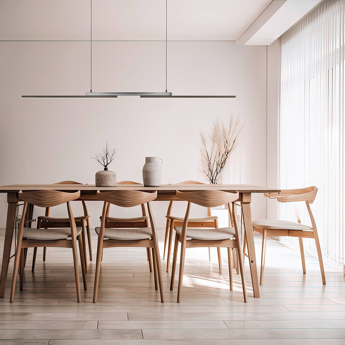 Die schlanke HELL Pendelleuchte More ist wie geschaffen für großzügige Essbereiche und lange Tische. Mit ihrer beeindruckenden Länge und dem schlanken, minimalistischen Design setzt die Leuchte ein markantes Statement über großen Esstischen in Küche und Esszimmer.