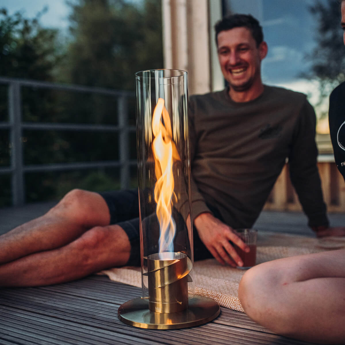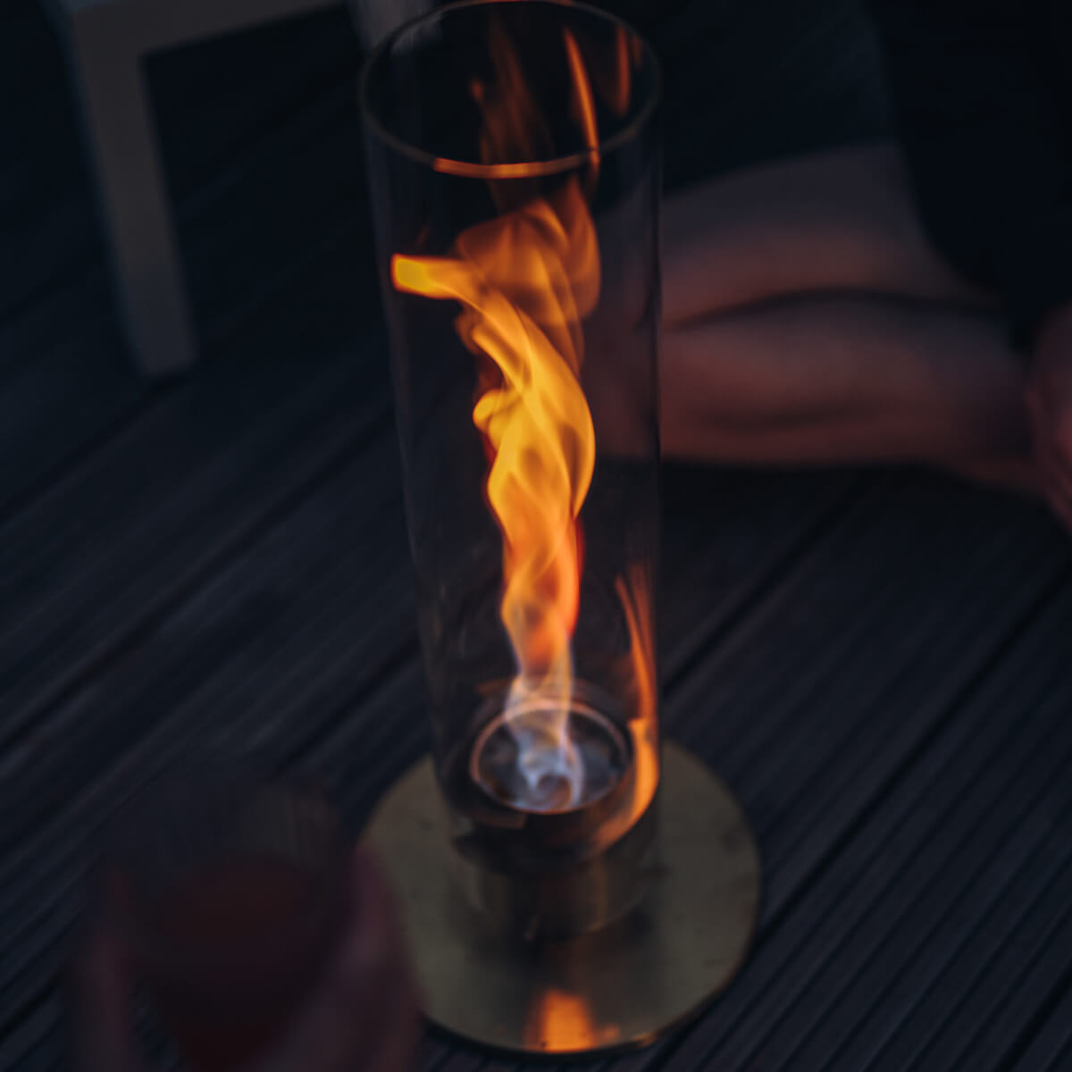 Der faszinierende Flammenzauber resultiert aus dem besonderen Aufbau des Tischfeuers. Im Inneren der Spin 120 befindet sich eine Edelstahldose, die mit Bioethanol befüllt und angezündet wird. Die entstehende Flamme wird durch drei Leitbleche zum Rotieren gebracht und über den Glaszylinder mit seinem Kamineffekt in die Höhe gezogen. Pro Füllung hält der Flammenwirbel für bis zu 80 Minuten an. Wer das Schauspiel früher beenden möchte, legt einfach den beigefügten Löschdeckel auf das Glas, woraufhin das Feuer in wenigen Sekunden zum Erliegen kommt.