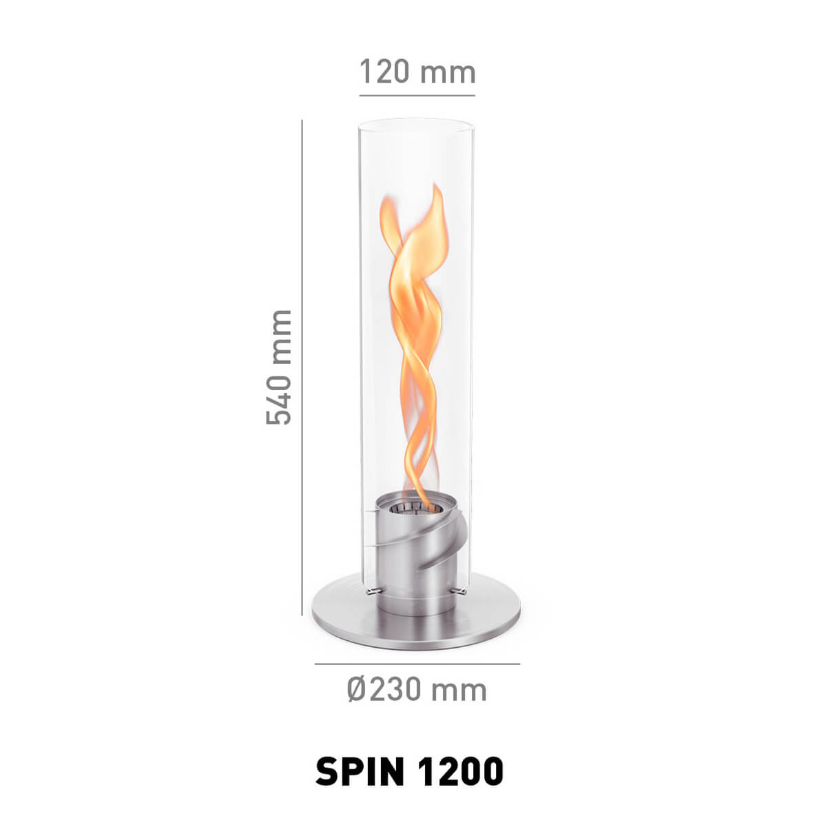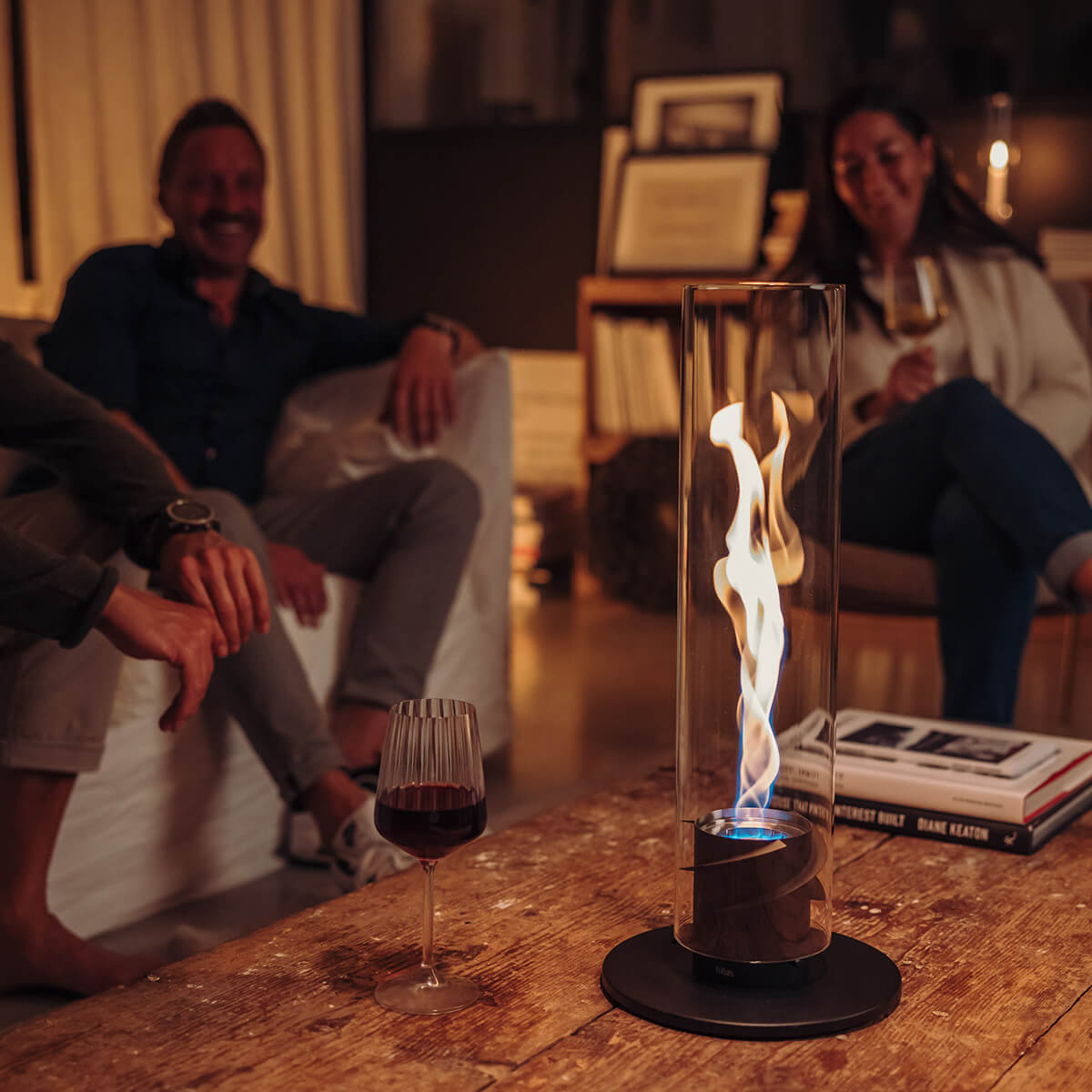 Die Funktionsweise der Spin 1200 basiert auf einem raffinierten System: Nach dem Entzünden des höfats Bioethanols und dem Aufsetzen des hitzeresistenten Borosilikatglaszylinders wird die Luft durch drei rotierende Flügel bewegt, was die Flammen in eine spiralförmige Bewegung versetzt. Diese Dynamik wird durch die Thermik und den Kamineffekt des Glases noch intensiviert, wodurch eine helle und markante Flammensäule entsteht. Mit einer beeindruckenden Abstrahlleistung von bis zu 2.000 Watt sorgt das Tischfeuer für wohlige Wärme, die weit über das hinausgeht, was herkömmliche Kerzen oder Teelichter bieten.