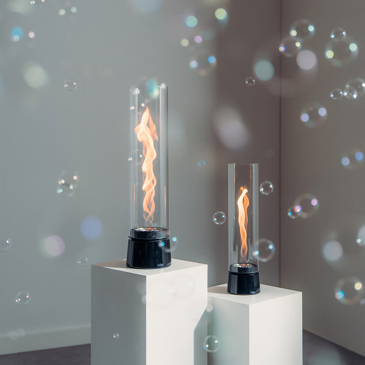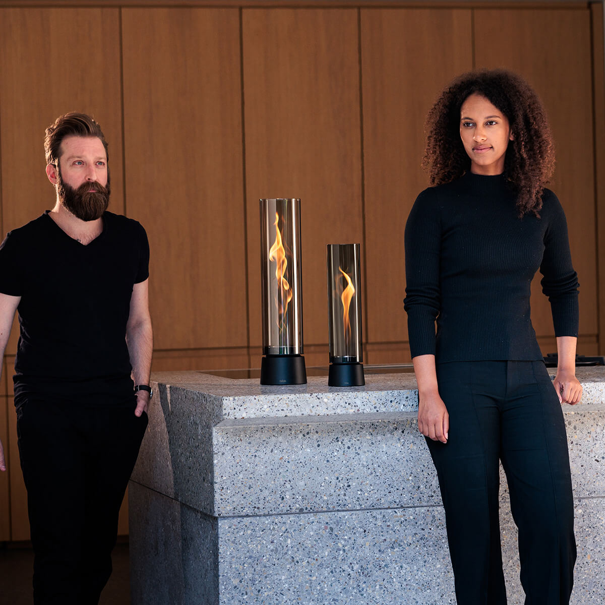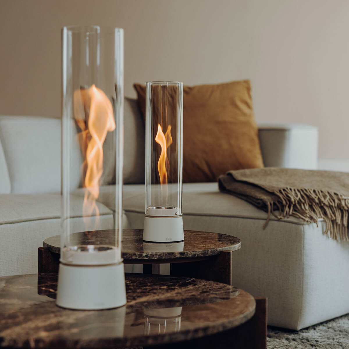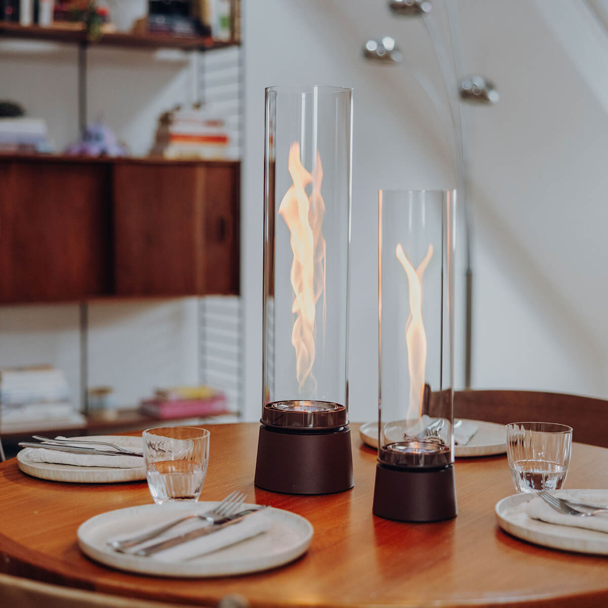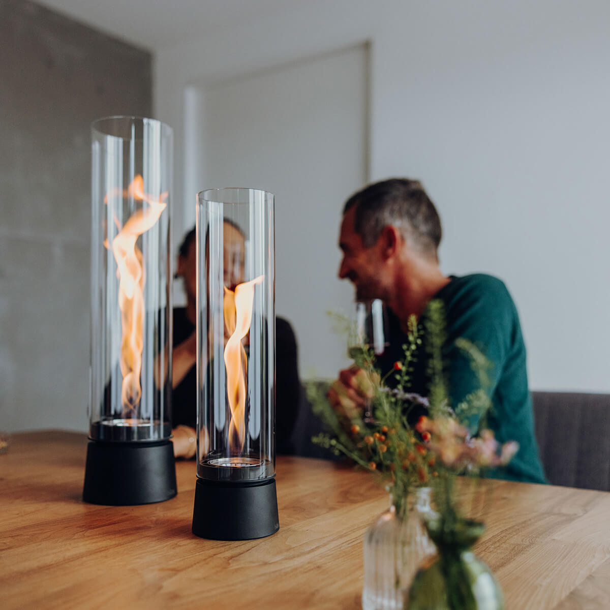 Besonders wohnlich wirkt das Tischfeuer mit Sockel in Eiche natur: Die feine Holzmaserung bringt ein Gefühl von Wärme und Behaglichkeit in Ihr Zuhause und setzt einen sanften Kontrast zu kühlen Materialien wie Beton oder Metall. Ein starkes Statement gelingt mit der Variante im All-Black-Look: Hier trifft ein mattschwarzer Sockel auf einen schwarz getönten Glaszylinder für ein besonders intensives Flammenbild.
