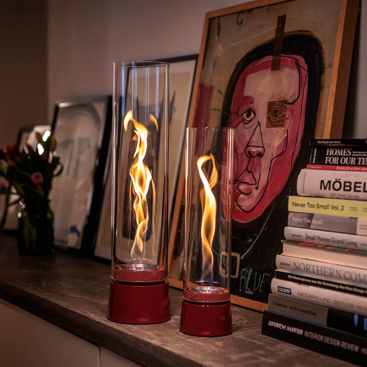 Besonders wohnlich wirkt das Tischfeuer mit Sockel in Eiche natur: Die feine Holzmaserung bringt ein Gefühl von Wärme und Behaglichkeit in Ihr Zuhause und setzt einen sanften Kontrast zu kühlen Materialien wie Beton oder Metall. Ein starkes Statement gelingt mit der Variante im All-Black-Look: Hier trifft ein mattschwarzer Sockel auf einen schwarz getönten Glaszylinder für ein besonders intensives Flammenbild.