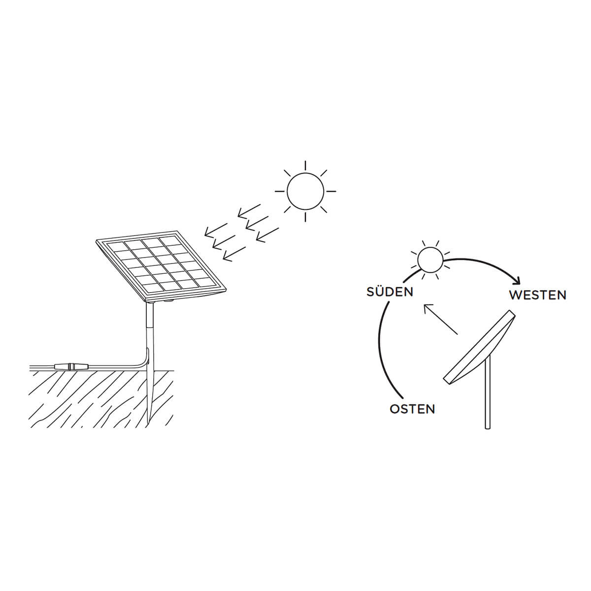 Nach zwei Sonnentagen à 10 Stunden in Südausrichtung ist das Solarpanel vollständig aufgeladen und bietet genügend Energie für etwa 15 Stunden Licht. Damit die Leistung des Panels optimal ausgenutzt wird, sollte die Solareinheit von Blättern, Zweigen oder Bäumen frei gehalten und idealerweise in einem 90°-Winkel zu den Sonnenstrahlen ausgerichtet werden. Reinigen Sie die Solarfläche bei Bedarf einfach mit einem Tuch und Wasser.