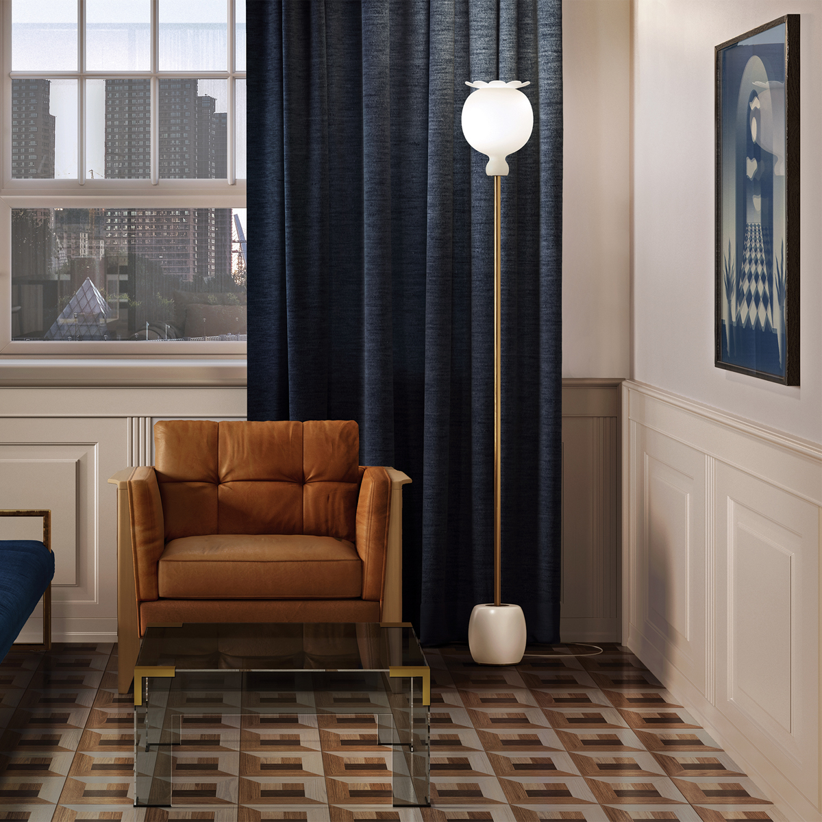 - Origineller Deckenfluter mit floral anmutendem Leuchtenkopf