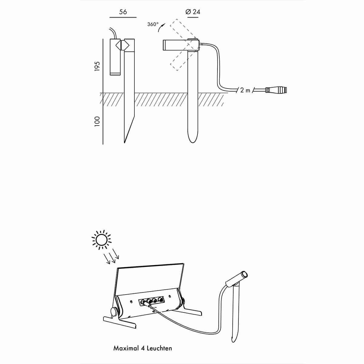 Der um 360° schwenkbare Strahlerkopf ermöglicht eine punktgenaue Lichtausrichtung – ideal für atmosphärische Highlights in Beeten, an Bäumen, Fassaden oder Skulpturen. Der Erdspieß sorgt für einen sicheren Halt im Boden, während das 2 Meter lange Anschlusskabel zusammen mit den mitgelieferten Kabeln der Ladestation einen Platzierungsradius von bis zu 8 Metern erlaubt. Ob am Wegesrand, im hinteren Gartenbereich oder an einer Sitzecke: Die Axent setzt dort Licht, wo Sie es möchten.