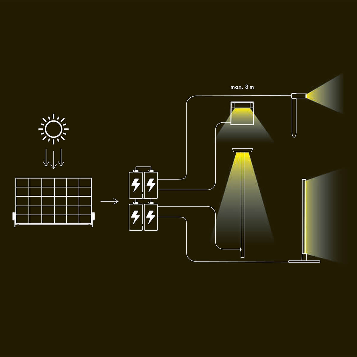 - Lässt sich mit bis zu 4 Solarlampen koppeln (max. Kabellänge je 8 m)