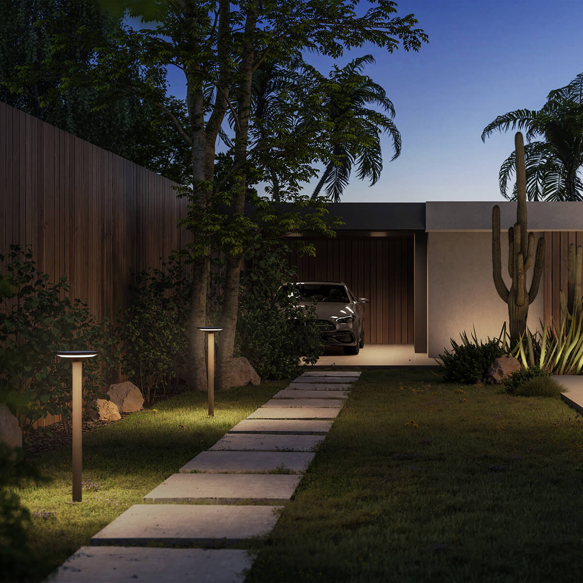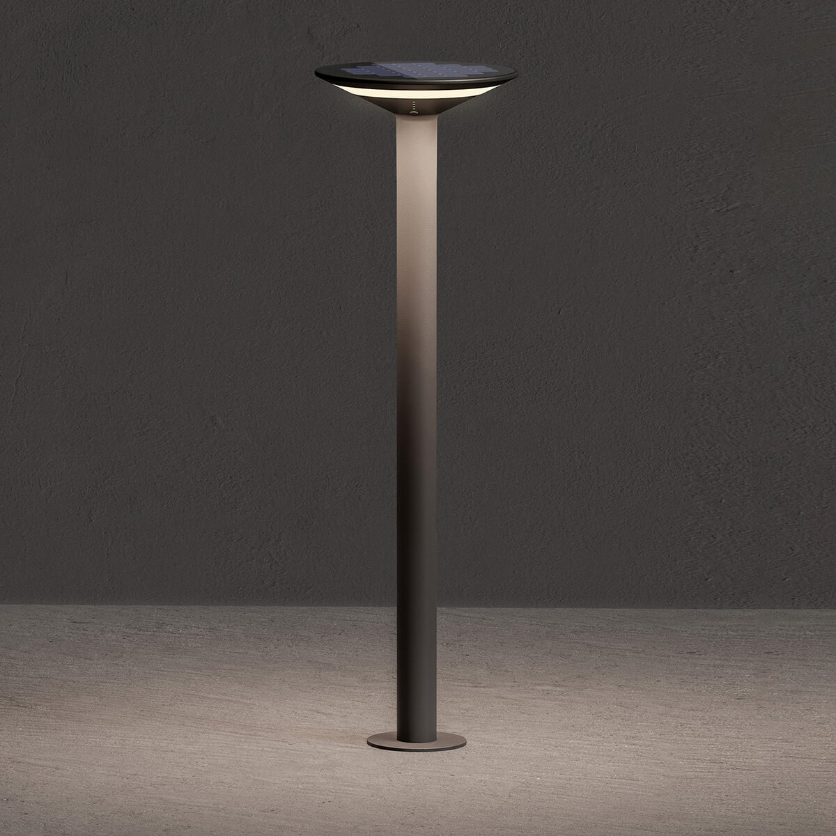 Die Keope Ground Solar-Außenleuchte ist aus Aluminium-Druckguss mit UV-beständiger Pulverbeschichtung gefertigt, ergänzt durch Schrauben aus rostfreiem Edelstahl. Das hochwertige Monokristallin-Solarpanel aus gehärtetem Glas lädt tagsüber effizient auf, während die austauschbare Lithium-Batterie für langfristige Einsatzbereitschaft sorgt.
