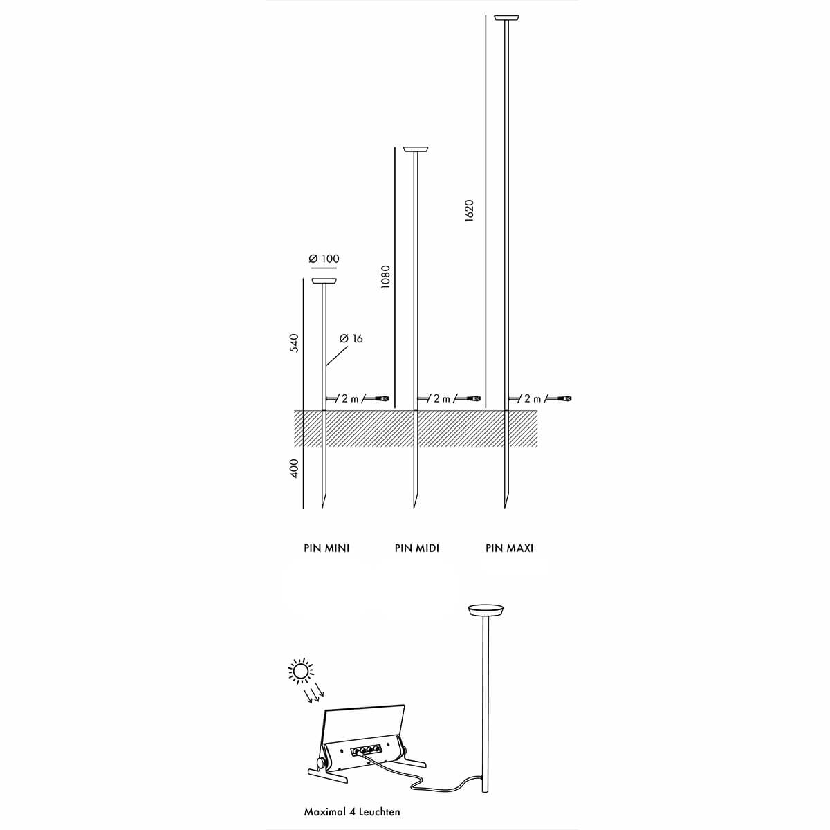 Die Leuchte begeistert durch ihr zeitloses Design und ihre filigrane Silhouette. Das Licht strahlt direkt nach unten und sorgt so für eine klare, blendfreie Ausleuchtung von Wegen und Beeten. Mit ihrer warmweißen Lichtfarbe schafft sie eine wohnliche, einladende Atmosphäre. In Kombination mit den höheren Lampen Pin Midi und Pin Maxi lassen sich abwechslungsreiche Lichtlandschaften gestalten – ideal für individuelle Gartenkonzepte oder repräsentative Außenanlagen.