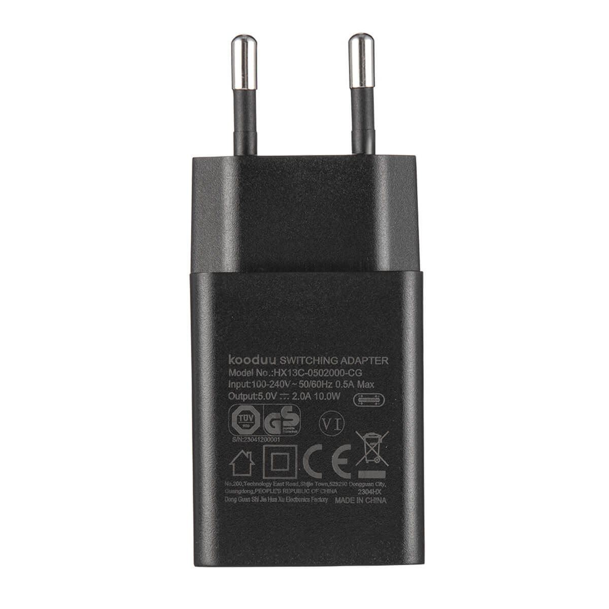 - Input: AC 100-240V, Output: 5V DC/max. 2A 10W