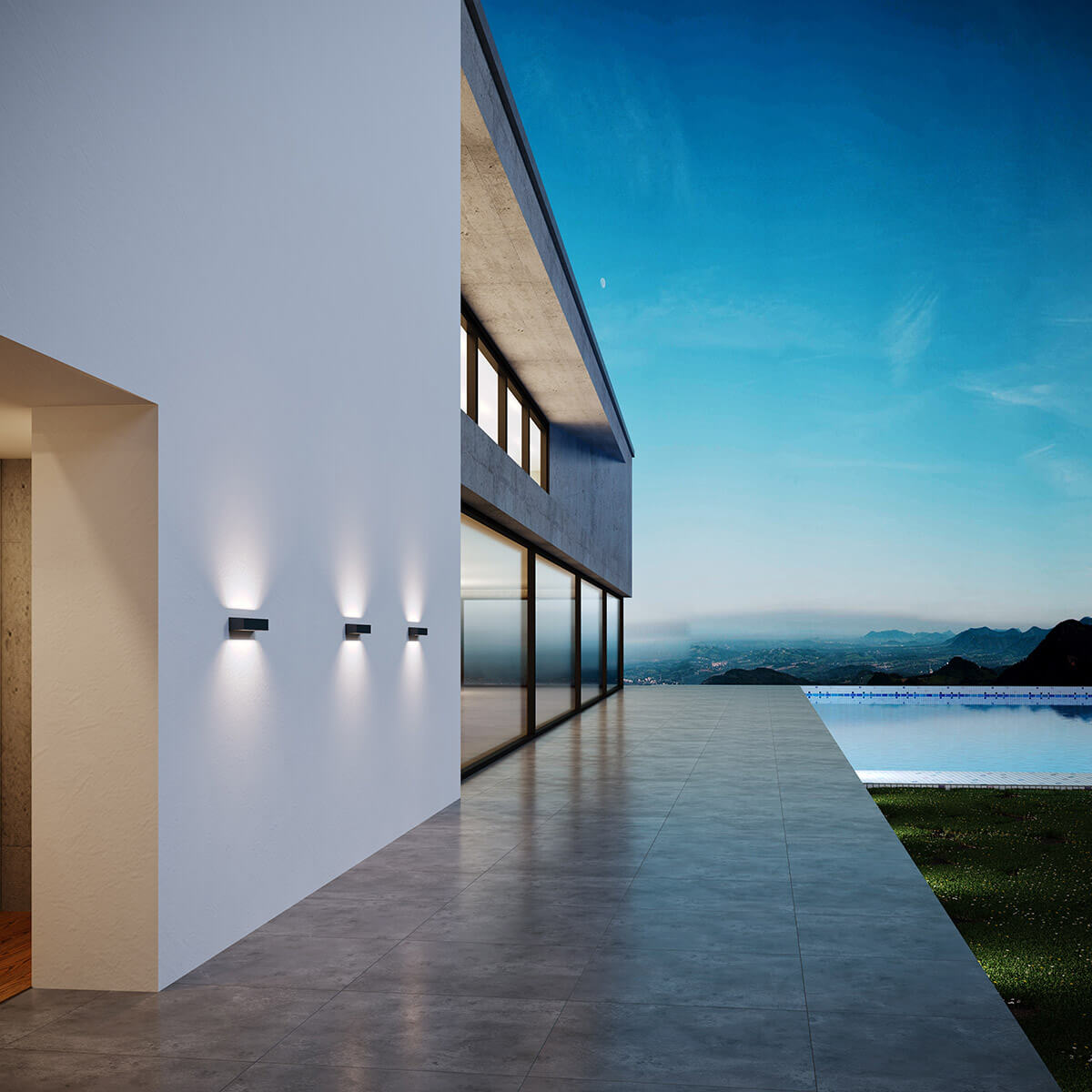 - Längliche Außenwandleuchte aus Aluminiumdruckguss mit einem Diffusor aus Glas