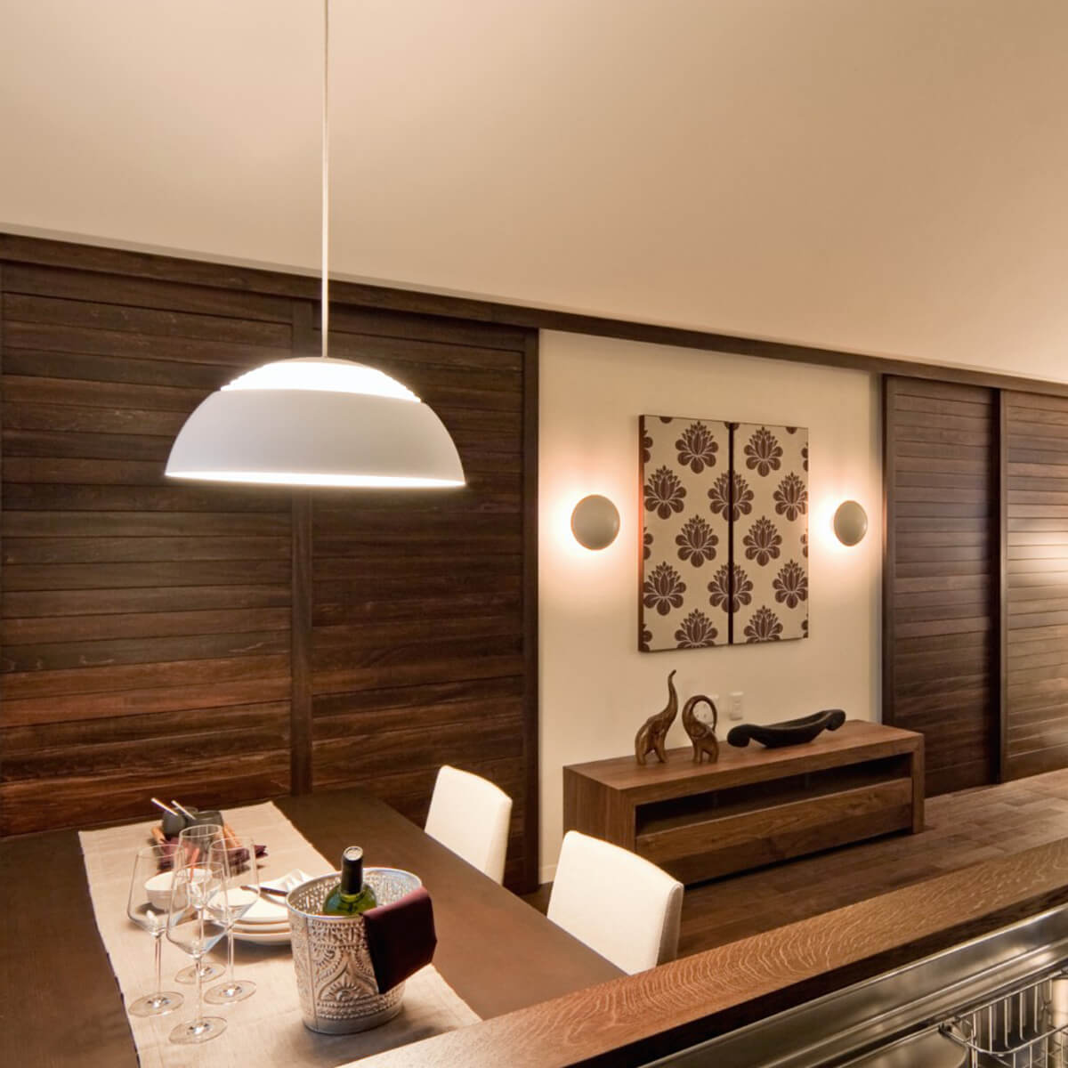 Charakteristisch für die Pendellampe ist ihr mehrteiliges, sphärisches Design mit abgestuften Ringlamellen auf der Oberseite. Diese lenken einen Teil des Lichts sanft nach oben und sorgen für eine indirekte Aufhellung des Raums. Nach unten schafft ein mattierter Acryldiffusor ein vollkommen blendfreies, gleichmäßiges Licht – ideal für Esstische, Kücheninseln, Theken oder großzügige Tischflächen. So entsteht eine ausgewogene Lichtatmosphäre, die funktional und zugleich wohnlich wirkt.