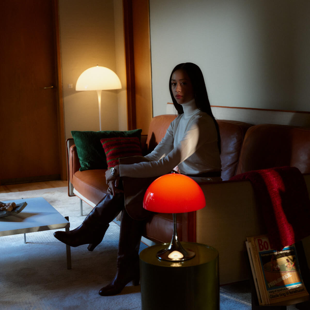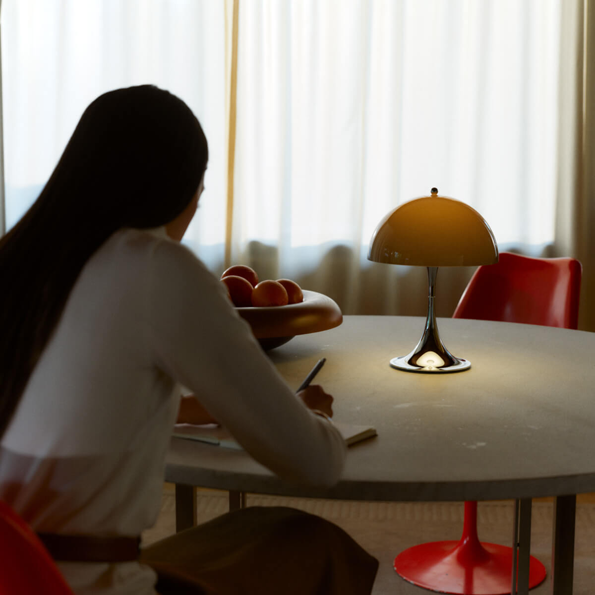 Typisch für die Panthella Leuchte ist das angenehm weiche, blendfreie Licht. Der opale Schirm verteilt das Licht gleichmäßig und reflektiert es sanft nach unten, während die organischen Formen von Schirm und Sockel als Reflektoren fungieren. So entsteht eine warme, atmosphärische Beleuchtung, die Räume behaglich wirken lässt und Farben harmonisch zur Geltung bringt.