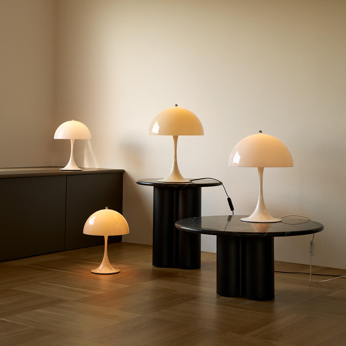 Die Panthella 320 verströmt ein angenehm weiches, blendfreies Licht, das sowohl durch den lichtdurchlässigen Schirm als auch durch die reflektierende Wirkung von Schirm und Fuß erzeugt wird. Dadurch entsteht eine sanfte, atmosphärische Beleuchtung, die Wohnzimmer, Hotels oder Lounges stilvoll akzentuiert. Der halbkugelförmige Schirm verleiht der Lampe eine skulpturale Präsenz – perfekt als dekoratives Lichtobjekt auf Sideboards, Beistelltischen oder Nachttischen.