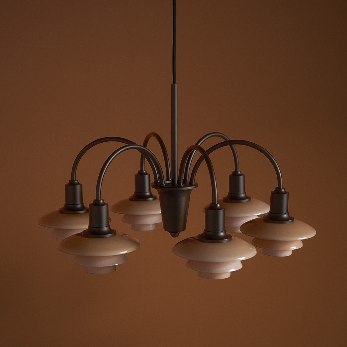 Die Schirme bestehen aus vierlagigem, mundgeblasenem Opalglas in Dusty Terracotta. Außen glänzend und innen sandgestrahlt mattweiß, erzeugen sie ein besonders weiches, diffuses und vollständig blendfreies Licht. Das reflektierende Mehrschirmsystem sorgt für hohen Sehkomfort und eine gleichmäßige, atmosphärische Ausleuchtung – ideal für großzügige Wohnräume, repräsentative Essbereiche, hohe Flure, Hotellobbys oder stilvolle Geschäftsräume.