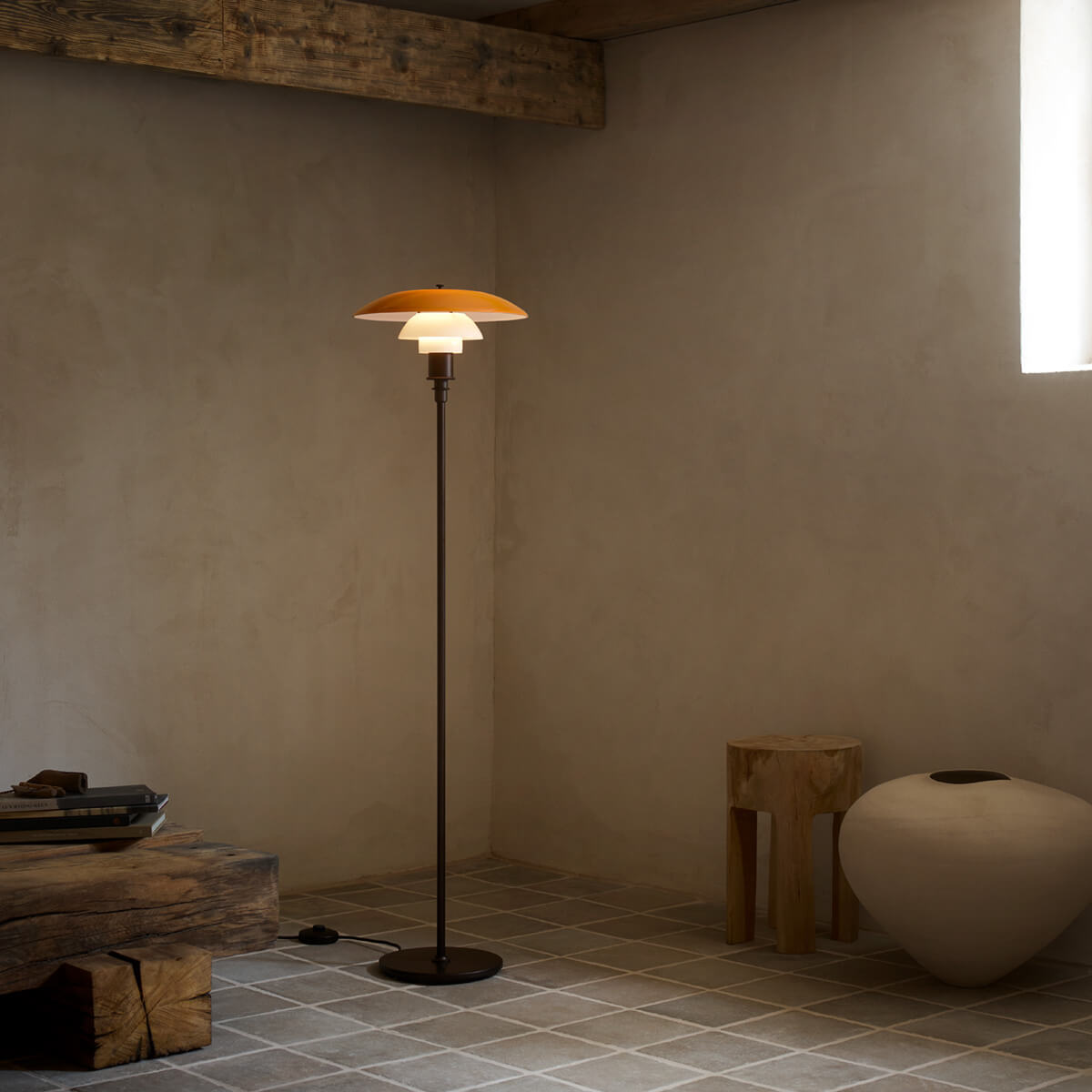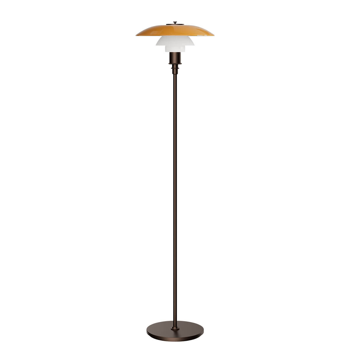 Wie alle PH Leuchten basiert auch die PH 3½-2½ Stehleuchte auf Henningsens mathematisch berechneter Dreischirm-Konstruktion. Zwei untere Schirme aus mundgeblasenem Opalglas und ein oberer Glasschirm in warmem Amber bilden eine faszinierende Lichtkomposition. Außen glänzend und innen sandgestrahlt mattweiß, erzeugen sie ein besonders weiches und vollständig blendfreies Licht. Während das Downlight angenehm nach unten abstrahlt und eine Lese- oder Sitzzone optimal ausleuchtet, sorgt der amberfarbene Oberschirm für ein warmes, atmosphärisches Umgebungslicht, das Innenräume sanft erhellt.