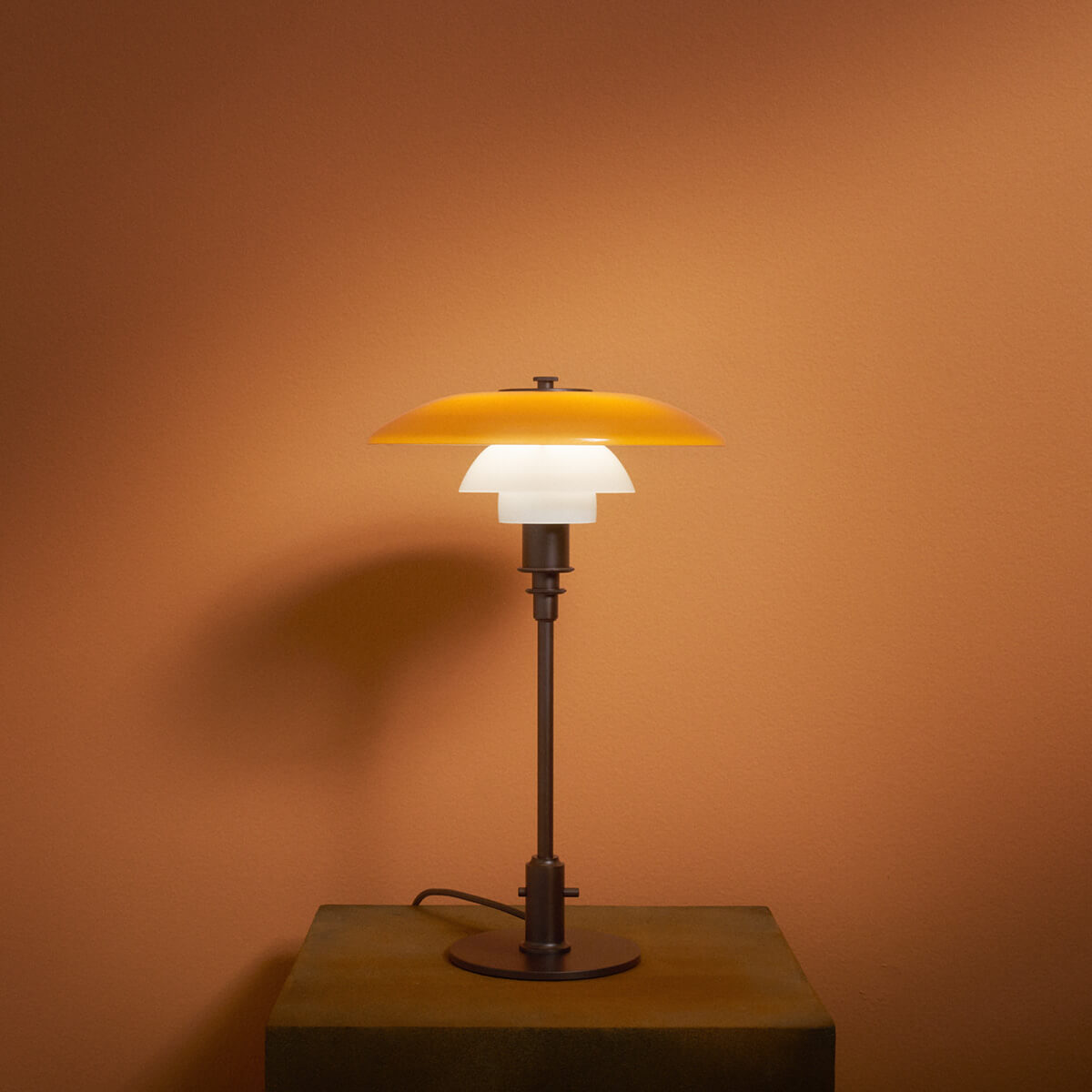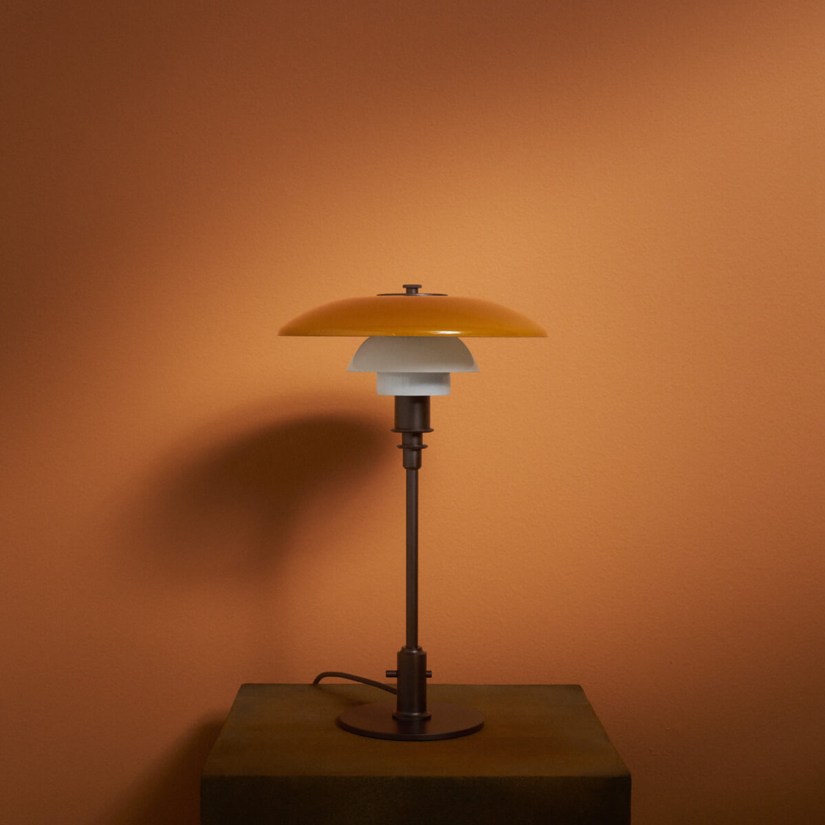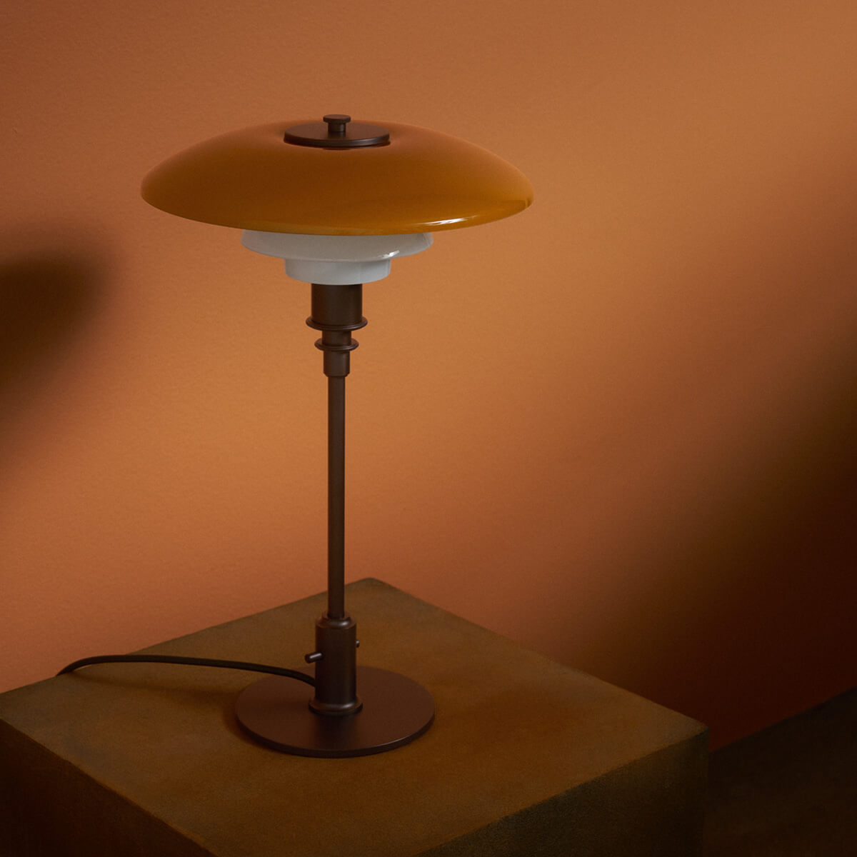 Ursprünglich 1927 eingeführt, basiert die PH 3/2 Tischlampe auf Henningsens präzise berechneter Dreischirm-Konstruktion. Ziel war es, ein blendfreies Licht mit optimaler Lichtverteilung zu schaffen. Die Centenary Edition kombiniert einen mundgeblasenen, oberen Schirm in warmem Amber mit zwei ebenfalls mundgeblasenen Opal-Unterschirmen. Außen glänzend und innen sandgestrahlt mattweiß, erzeugen sie ein harmonisches Zusammenspiel aus sanftem Downlight und atmosphärischem, nach oben gerichtetem Umgebungslicht. Das Ergebnis ist höchster Lichtkomfort – weich, blendfrei und stimmungsvoll zugleich.