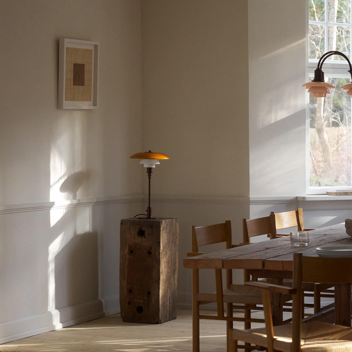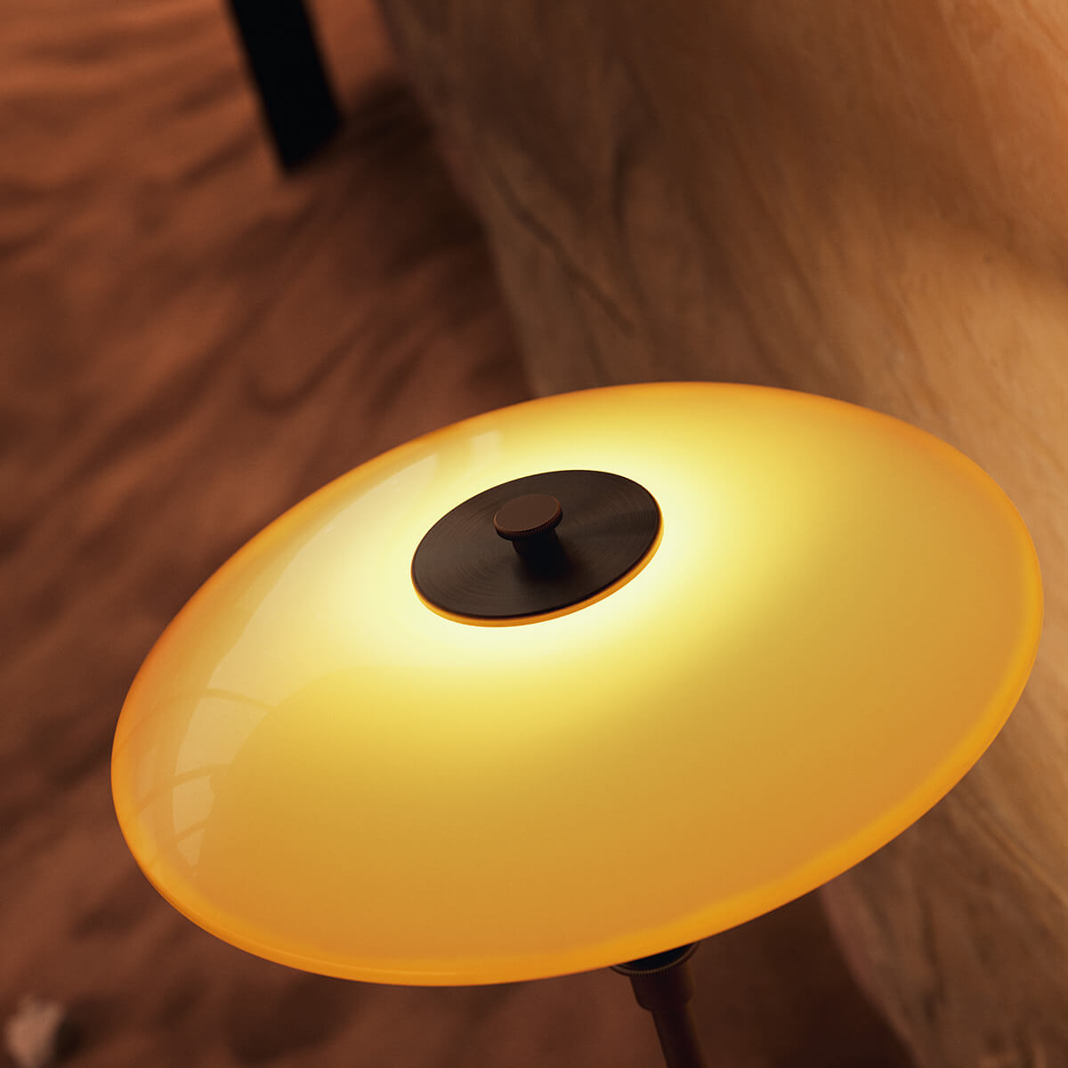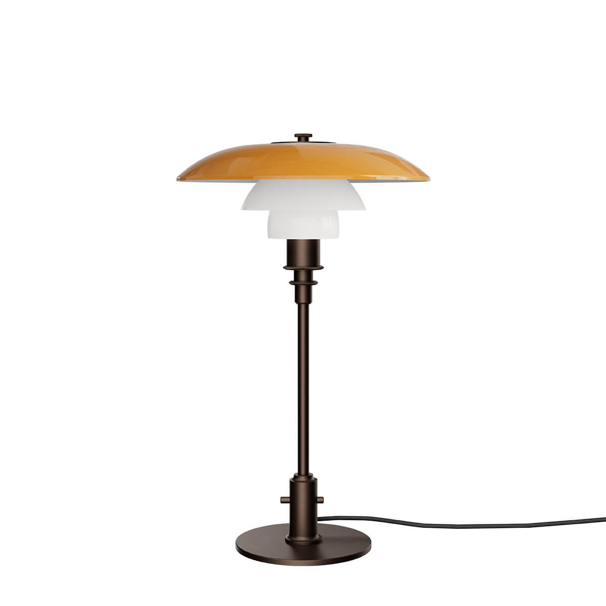 Ursprünglich 1927 eingeführt, basiert die PH 3/2 Tischlampe auf Henningsens präzise berechneter Dreischirm-Konstruktion. Ziel war es, ein blendfreies Licht mit optimaler Lichtverteilung zu schaffen. Die Centenary Edition kombiniert einen mundgeblasenen, oberen Schirm in warmem Amber mit zwei ebenfalls mundgeblasenen Opal-Unterschirmen. Außen glänzend und innen sandgestrahlt mattweiß, erzeugen sie ein harmonisches Zusammenspiel aus sanftem Downlight und atmosphärischem, nach oben gerichtetem Umgebungslicht. Das Ergebnis ist höchster Lichtkomfort – weich, blendfrei und stimmungsvoll zugleich.
