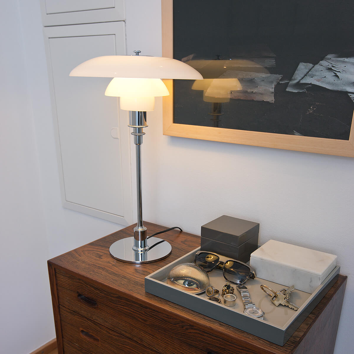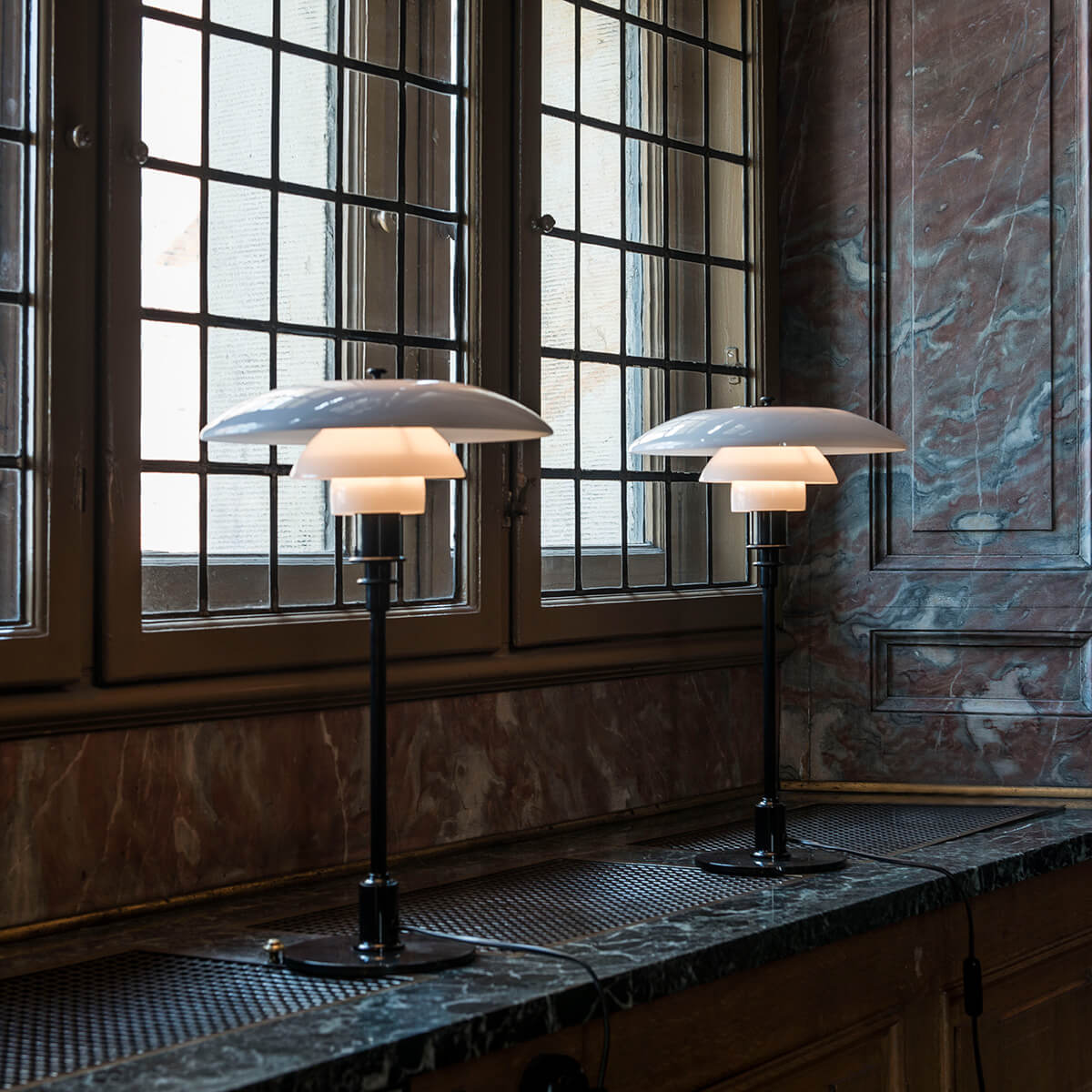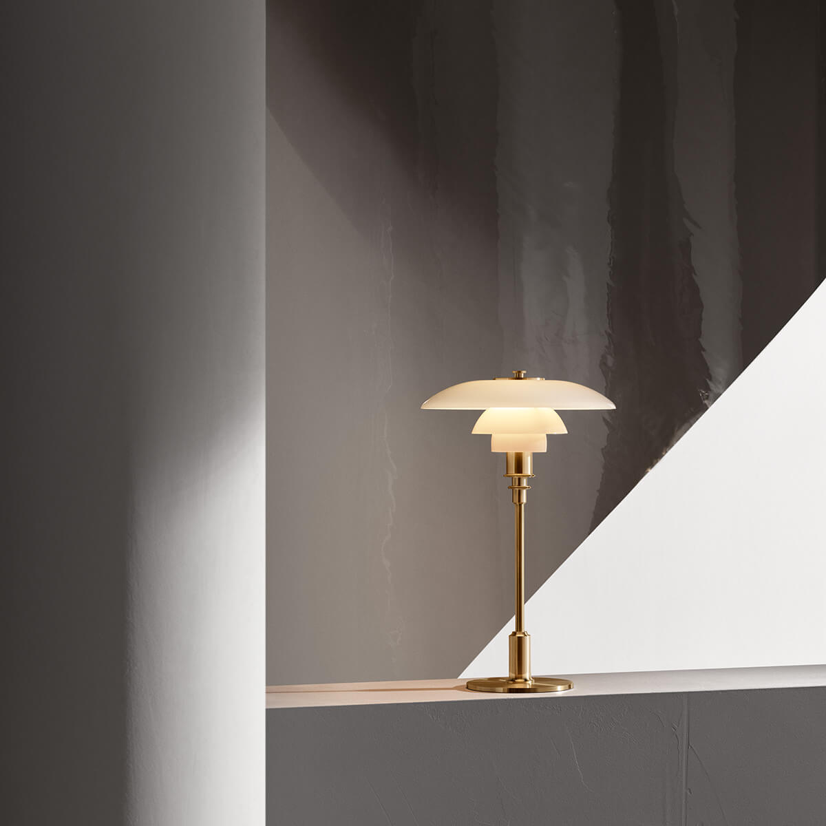 Poul Henningsen, ein Pionier der Lichtforschung, entwarf den dreiteiligen Leuchtenschirm bereits in den Jahren 1925/26. Die ersten Modelle, die in Zusammenarbeit mit Louis Poulsen entstanden, wurden auf einer Pariser Ausstellung präsentiert. Henningsens Ziel war es, Lampen zu entwickeln, die blendfreies Licht ausstrahlen, weiche Schatten werfen und das Licht gezielt lenken. Die PH 3/2 Tischleuchte ist Teil einer umfassenden Serie von Modellen mit dreiteiligem Schirm, die alle auf Henningsens wissenschaftlichen Studien zum Licht basieren. Dank der Verwendung von Glas erzielte er eine gleichmäßige Lichtstreuung und eine diffuse Reflexion, sodass Blendeffekte und Schatten nach Bedarf gesteuert werden können.