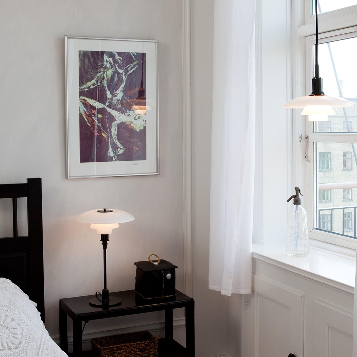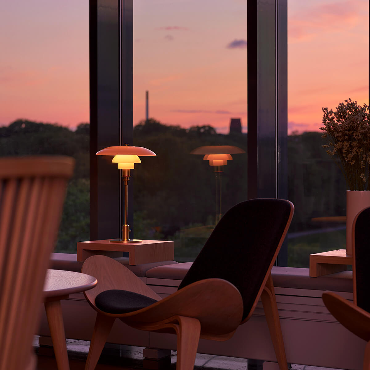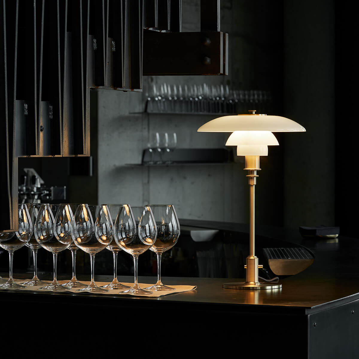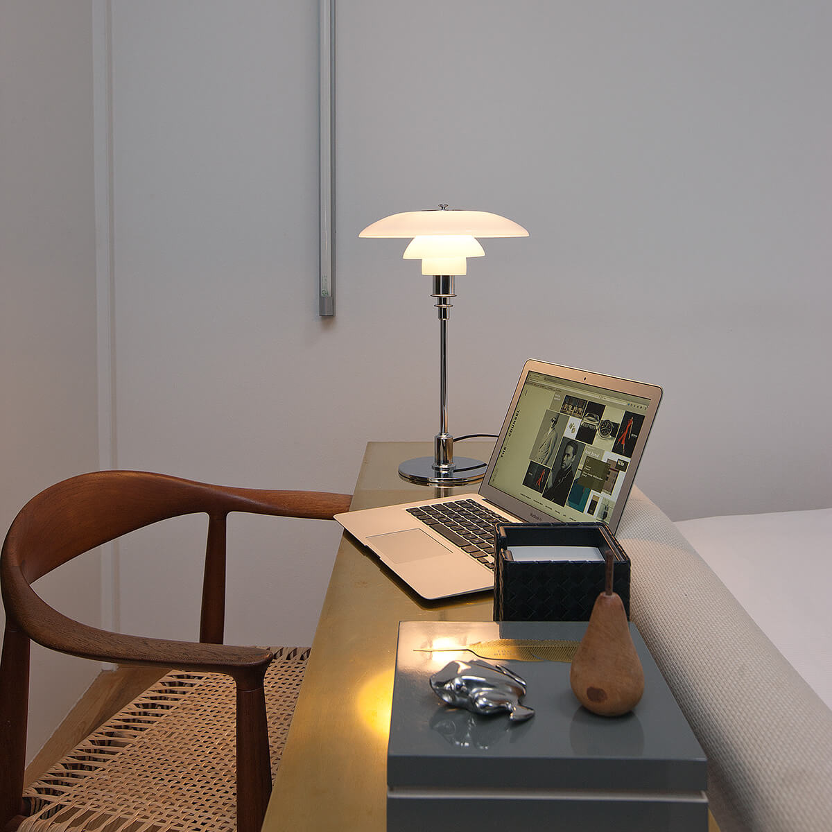 Poul Henningsen, ein Pionier der Lichtforschung, entwarf den dreiteiligen Leuchtenschirm bereits in den Jahren 1925/26. Die ersten Modelle, die in Zusammenarbeit mit Louis Poulsen entstanden, wurden auf einer Pariser Ausstellung präsentiert. Henningsens Ziel war es, Lampen zu entwickeln, die blendfreies Licht ausstrahlen, weiche Schatten werfen und das Licht gezielt lenken. Die PH 3/2 Tischleuchte ist Teil einer umfassenden Serie von Modellen mit dreiteiligem Schirm, die alle auf Henningsens wissenschaftlichen Studien zum Licht basieren. Dank der Verwendung von Glas erzielte er eine gleichmäßige Lichtstreuung und eine diffuse Reflexion, sodass Blendeffekte und Schatten nach Bedarf gesteuert werden können.