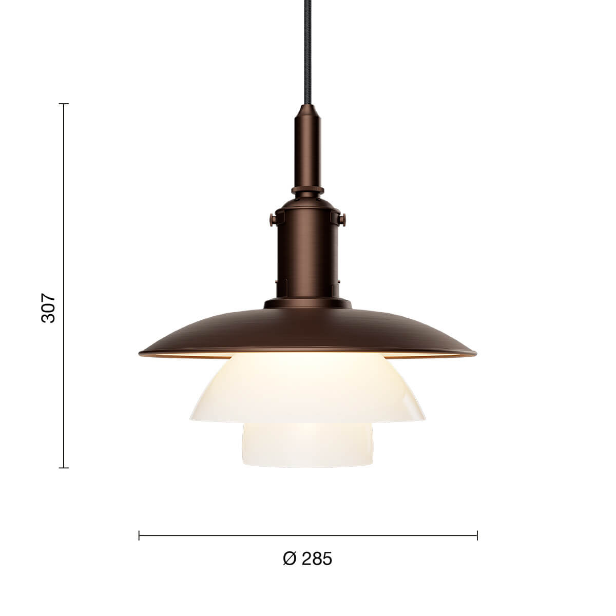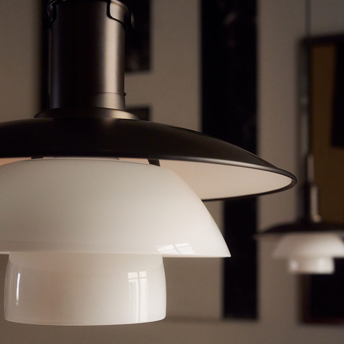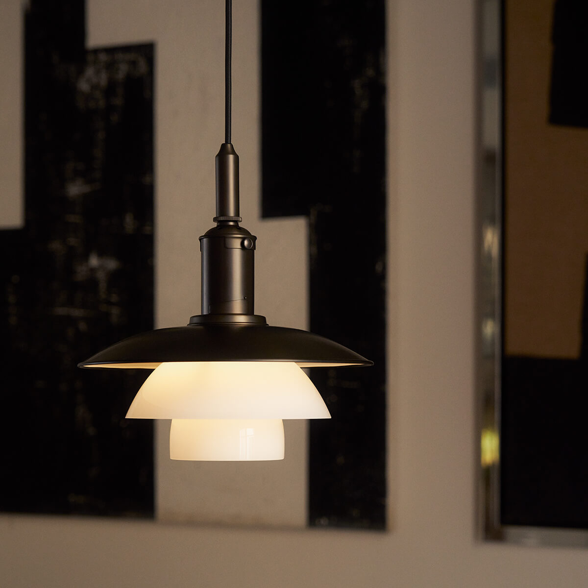 Der obere Schirm besteht aus dunkelbraun lackiertem, brüniertem Messing mit einer fein gearbeiteten Haarlinienstruktur – ein dezenter Verweis auf die Originalentwürfe der 1920er-Jahre. Seine weiß lackierte Innenseite reflektiert das Licht nach unten und sorgt für eine angenehme Zonenbeleuchtung. Die mittleren und unteren Schirme aus mundgeblasenem, dreischichtigem Opalglas – außen glänzend, innen sandgestrahlt – streuen das Licht weich und gleichmäßig. Abgerundet wird der elegante Look durch ein schwarzes Textilkabel und einen Baldachin aus brüniertem Messing.