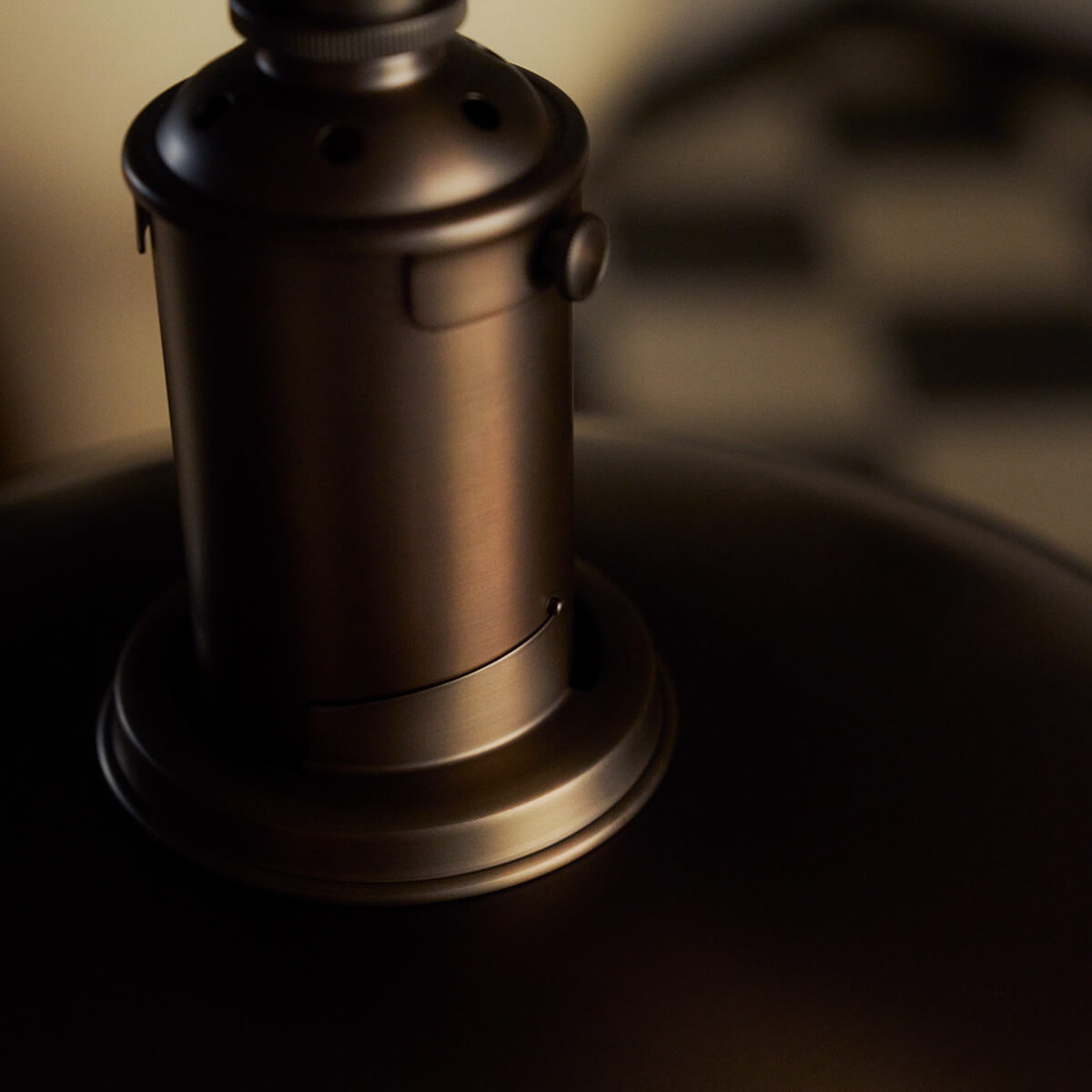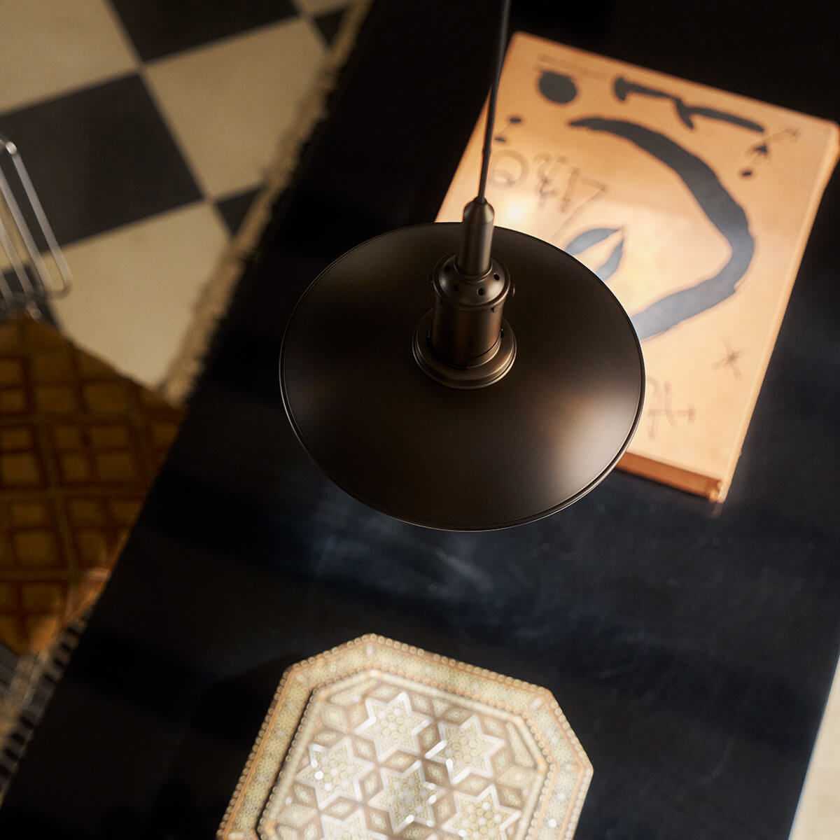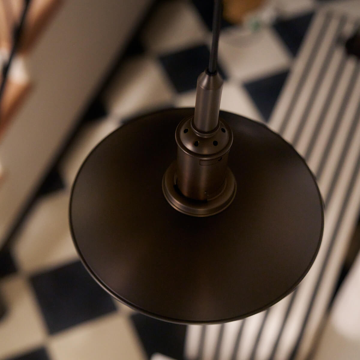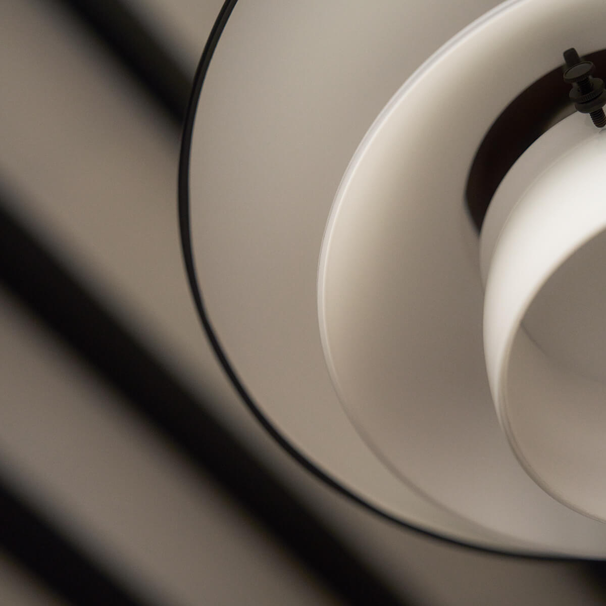 Der obere Schirm besteht aus dunkelbraun lackiertem, brüniertem Messing mit einer fein gearbeiteten Haarlinienstruktur – ein dezenter Verweis auf die Originalentwürfe der 1920er-Jahre. Seine weiß lackierte Innenseite reflektiert das Licht nach unten und sorgt für eine angenehme Zonenbeleuchtung. Die mittleren und unteren Schirme aus mundgeblasenem, dreischichtigem Opalglas – außen glänzend, innen sandgestrahlt – streuen das Licht weich und gleichmäßig. Abgerundet wird der elegante Look durch ein schwarzes Textilkabel und einen Baldachin aus brüniertem Messing.