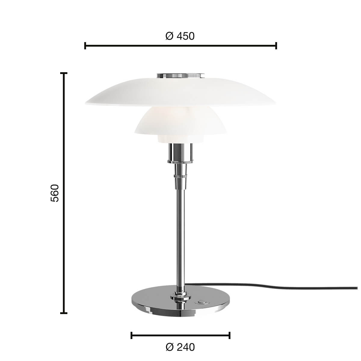 Mit ihrer eleganten Kombination aus Opalglas und hochglänzendem Chrom, ergänzt durch ein schwarzes Leuchtenkabel und einen praktischen Schalter im Leuchtenfuß, wird die PH 4½-3½ von Poul Henningsen zu einer hochwertigen Designerlampe, die Funktionalität, Geschichte und Ästhetik harmonisch vereint.
