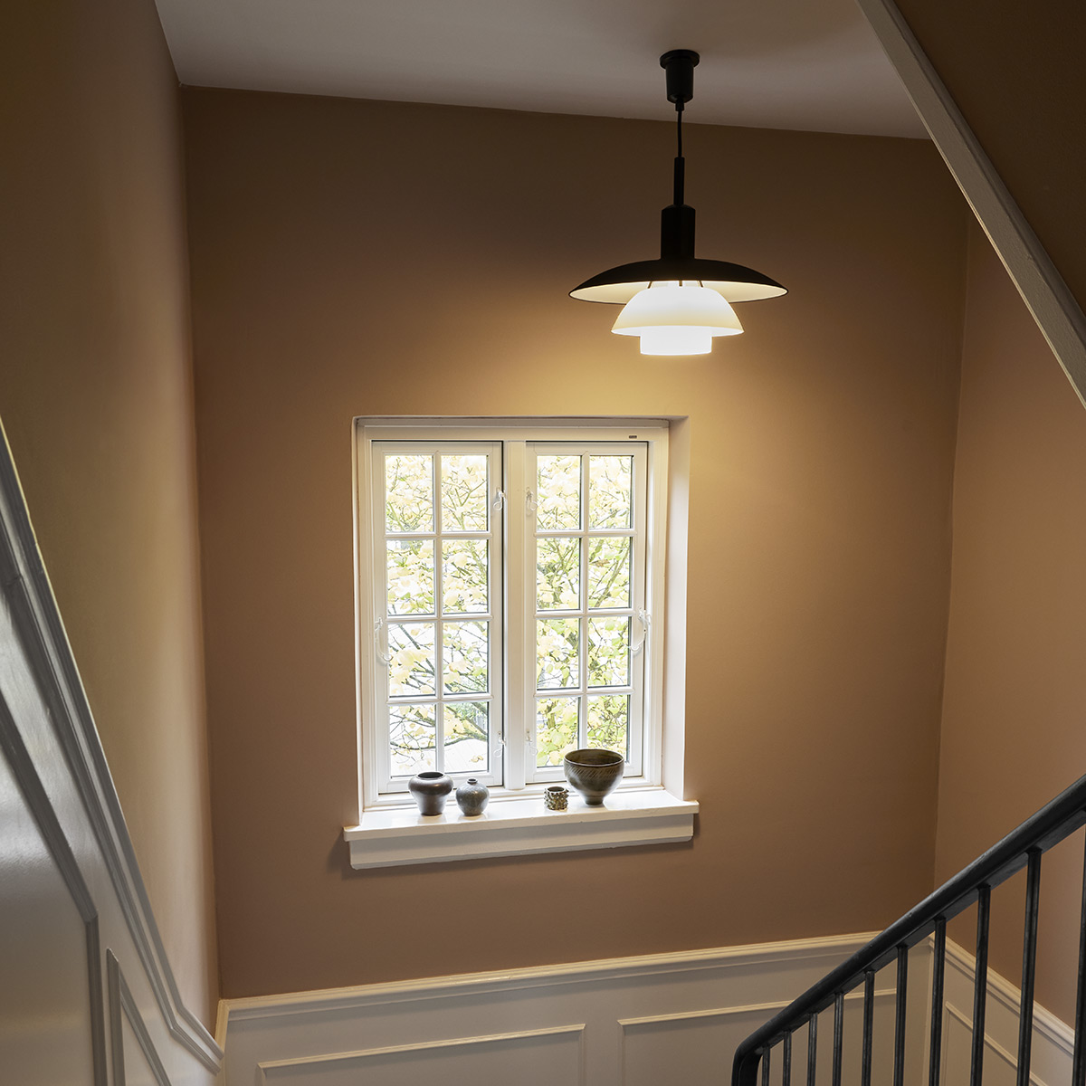 Dank des reflektierenden Dreischirmsystem von Poul Henningsen strahlt die PH 5/5 Pendellampe ein diffuses und angenehmes Licht ab. Je nach Ausführung ergibt sich ein andersartiges Lichtbild: Bei der Version mit mattschwarz lackierten Metallschirmen und Soft-Touch-Finish wird das ausstrahlende Licht vornehmlich nach unten geleitet. Bei der Variante, die einen metallenen Oberschirm mit zwei durchscheinenden Opalglasschirmen kombiniert, erstrahlt das Licht auch zu den Seiten hin.