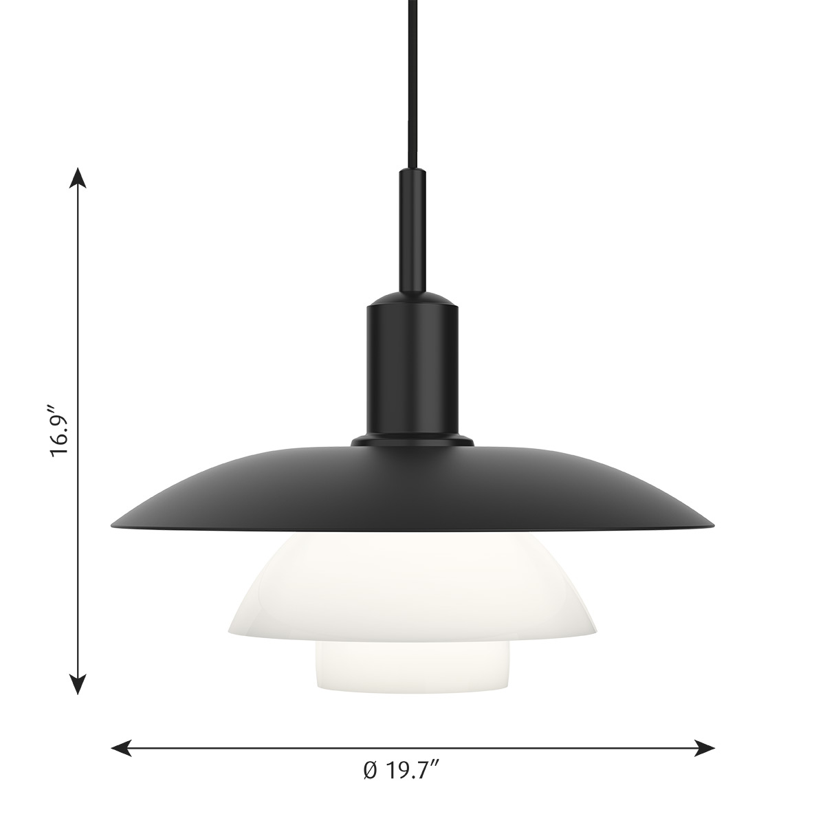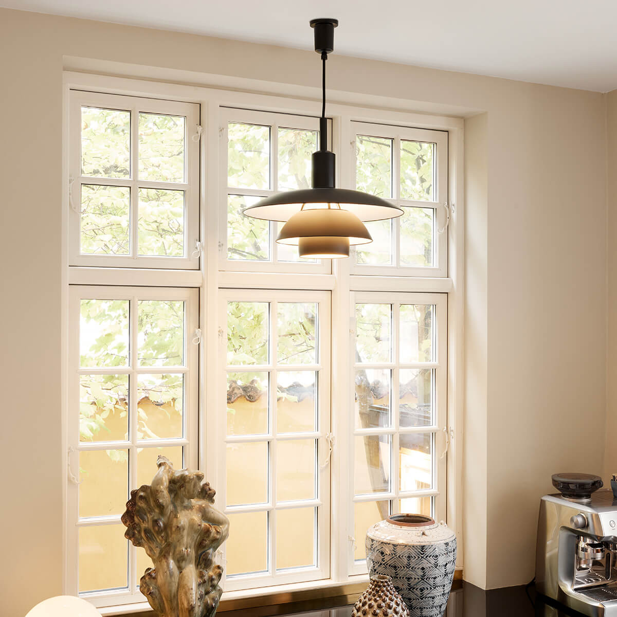 Erhältlich ist die Louis Poulsen PH 5/5 Pendelleuchte in einer Version mit mattschwarz lackiertem Metallschirm und Soft-Touch-Finish sowie in einer Variante, in der ein metallener Oberschirm mit zwei durchscheinenden Opalglasschirmen kombiniert ist. Erstere dient einem primär nach unten gerichteten Lichtaustritt, bei Letzterer erstrahlt das Licht auch zu den Seiten hin.