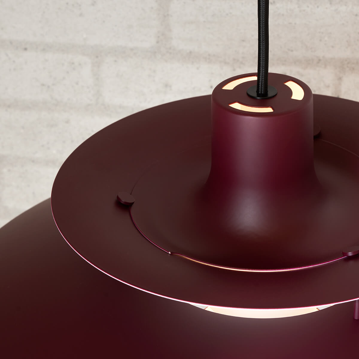 Die Hängelampe strahlt ein angenehmes, blendfreies Licht ab, das durch das innovative Dreischirmsystem von Poul Henningsen ermöglicht wird. Der Großteil des Lichts wird nach unten gerichtet, während ein weiterer Teil zur Seite hin ausstrahlt und die Leuchte selbst in ein sanftes Licht taucht. Um sicherzustellen, dass das nach unten gerichtete Licht völlig blendfrei ist, ist der untere Schirm mit einem Diffusor aus mattiertem Glas versehen.