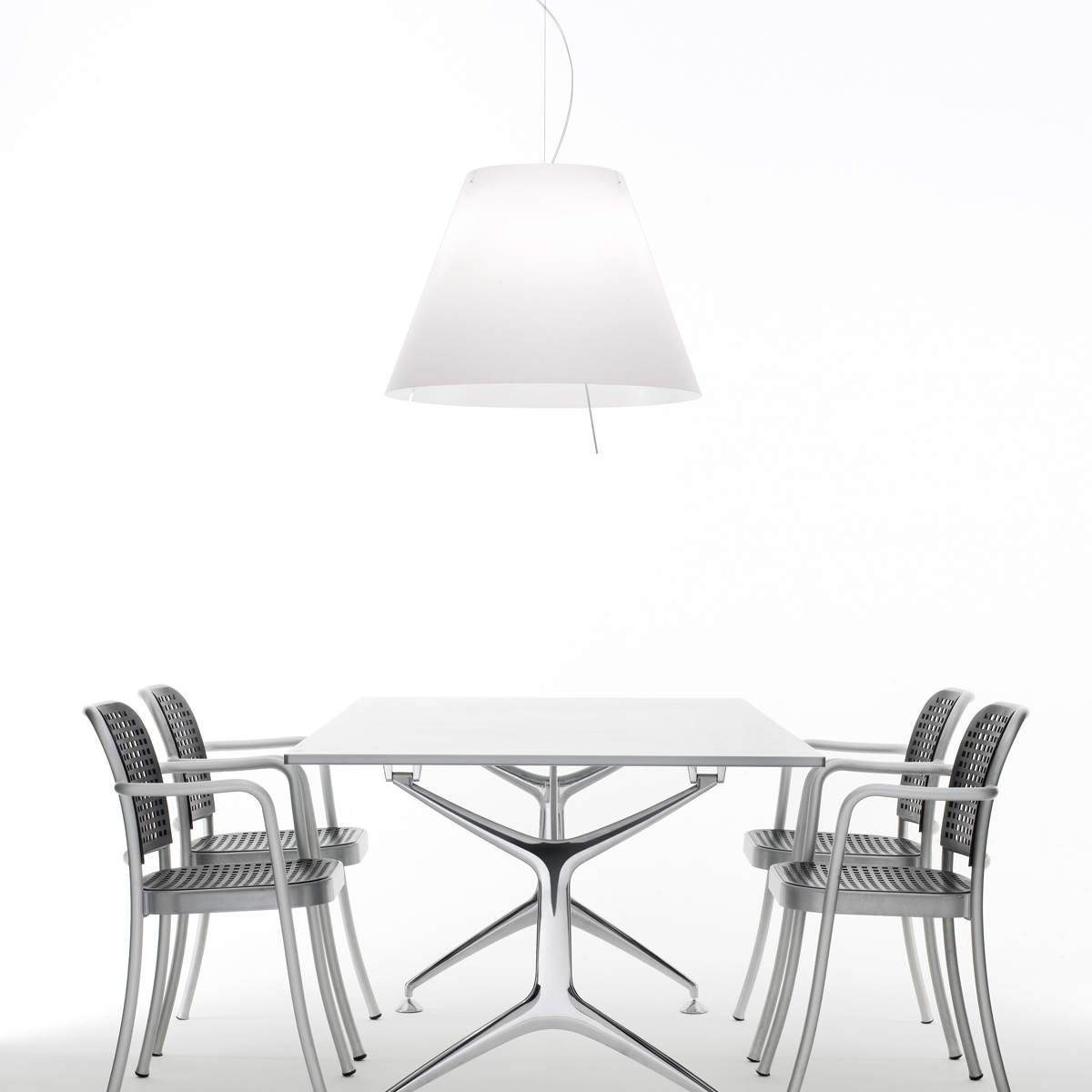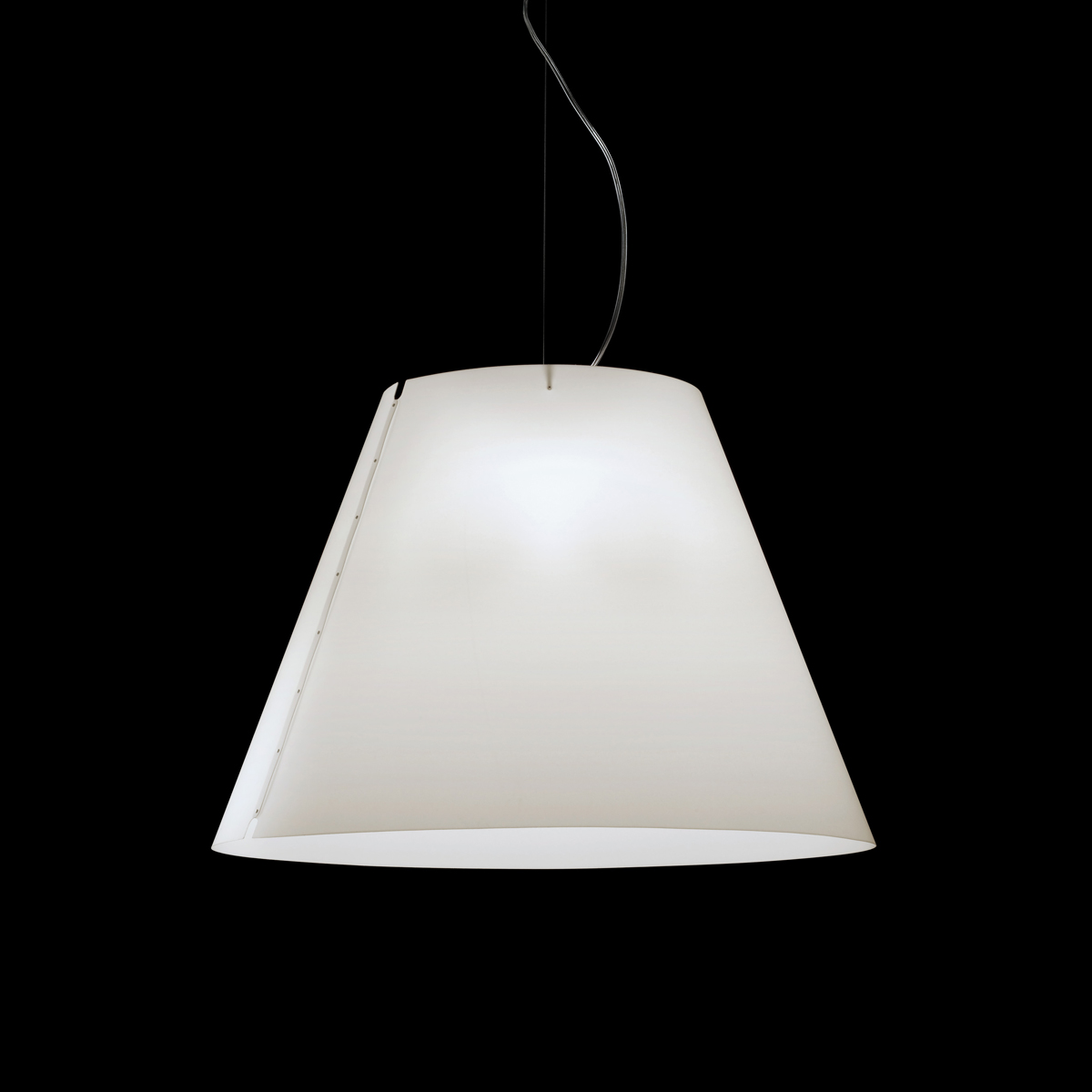 Obgleich von maximaler Dimension, wirkt die Luceplan Grande Costanza Sospensione ausgewogen und leicht. Hierzu trägt nicht nur die klare Formensprache bei, sondern auch das Material des Leuchtenschirms: Aus widerstandsfähigem Polycarbonat gefertigt, ist er von nur geringem Gewicht.