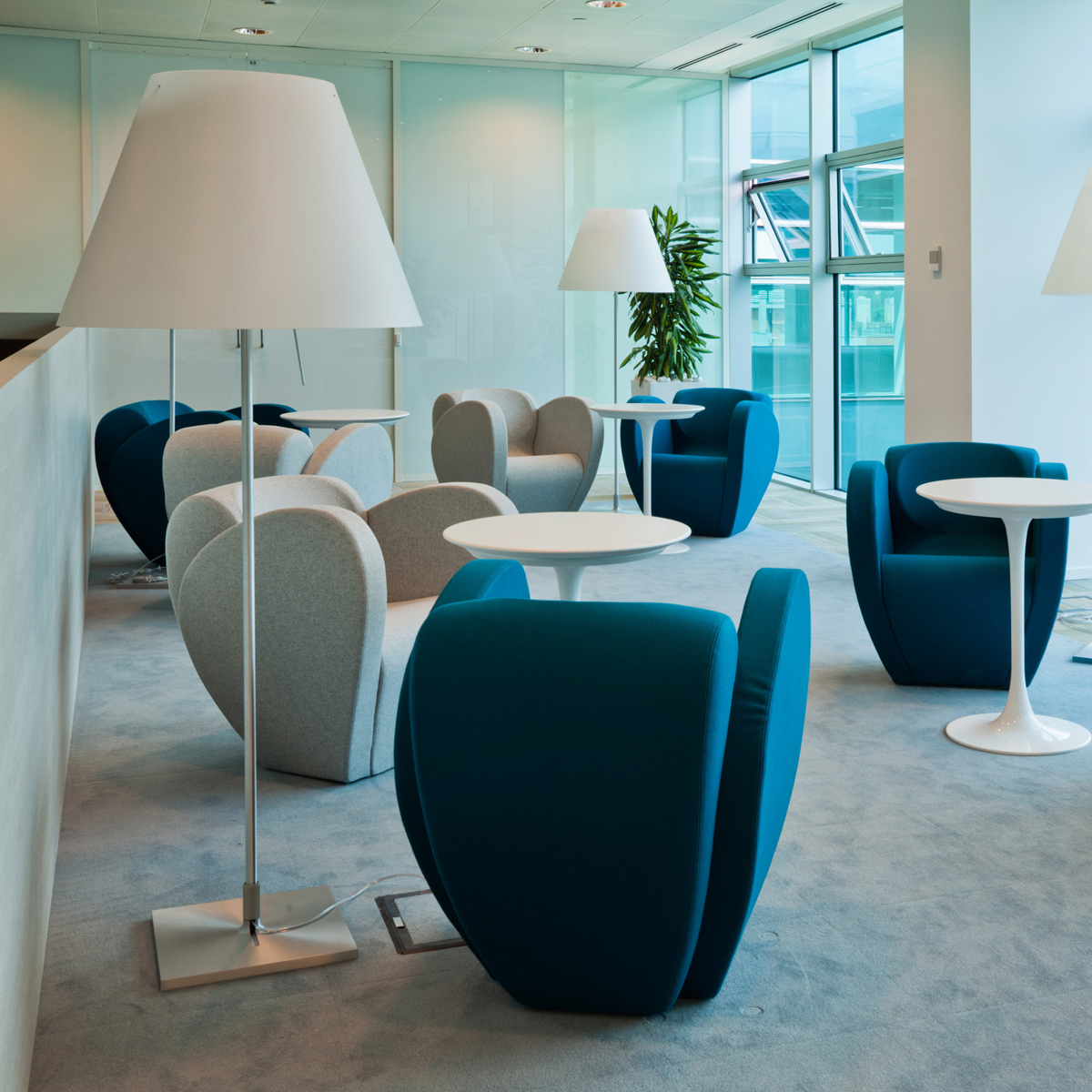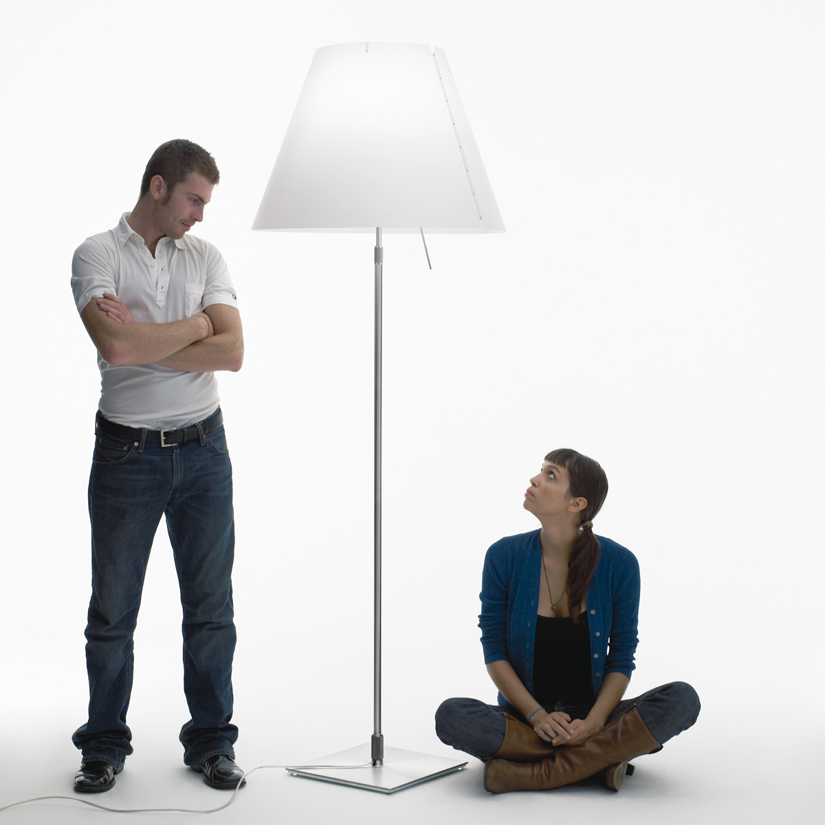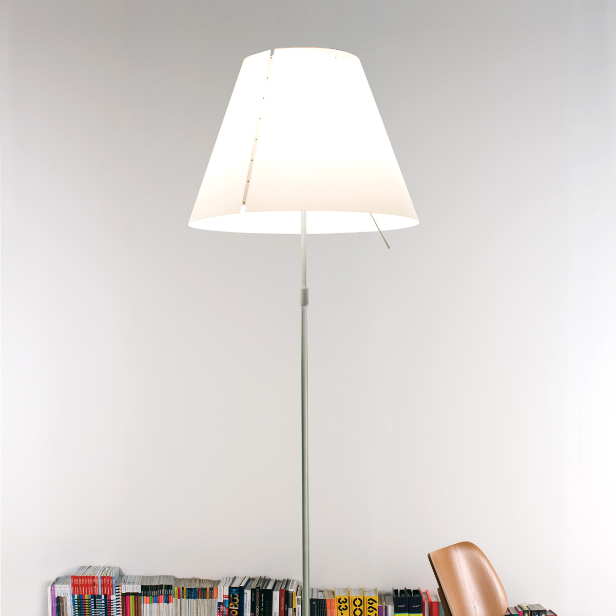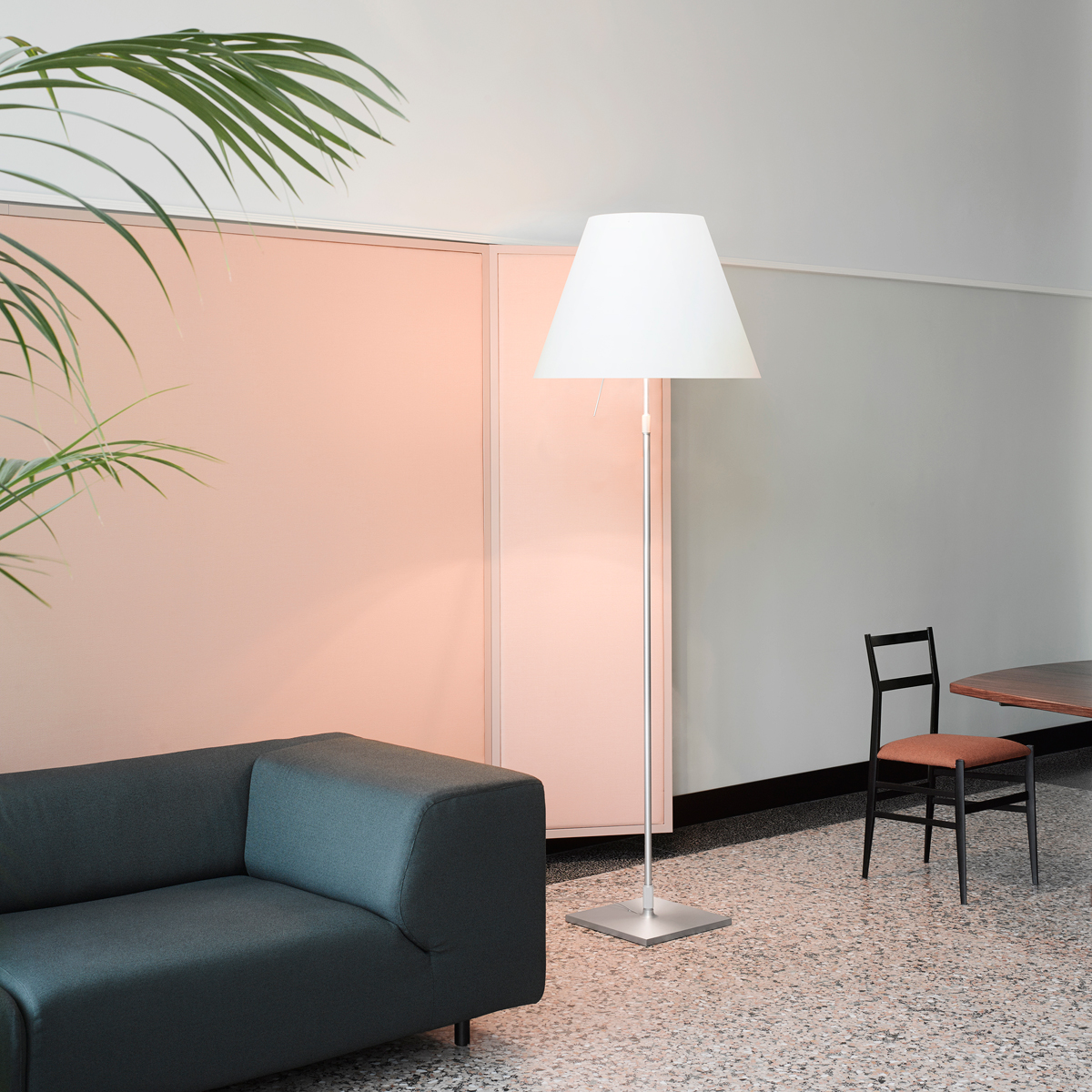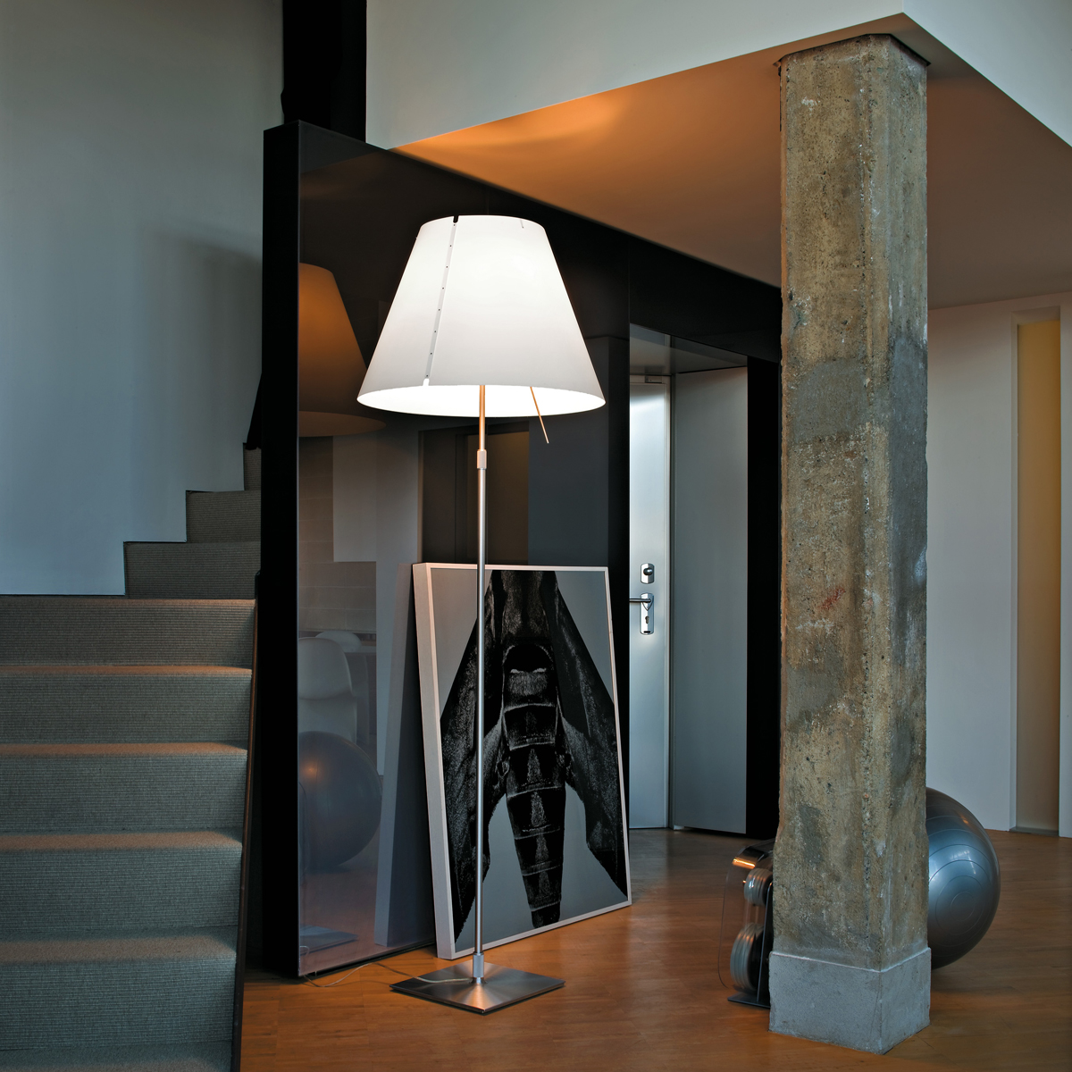 Hierdurch eignet sich Grande Costanza Terra vor allem zur Ausleuchtung größerer Raumbereiche: etwa in Lobbies, stilvollen Wartesälen oder einem großflächigen Wohnzimmer, wie es sich etwa in Altbauten finden lässt. Hier sorgt die Stehleuchte für ein intensives, behagliches und diffus gestreutes Licht. Praktischen Nutzen erhält die Luceplan Grande Costanza Terra aufgrund ihres Teleskopständers, durch den sich der Leuchtenschirm in seiner Höhe regulieren lässt.