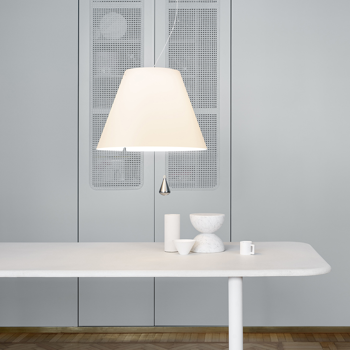 In der Lady Costanza Sospensione, von dem italienischen Designer Paolo Rizzatto kreiert, wurde die charakteristische Eleganz der Luceplan Costanza Leuchtenkollektion auf eine Pendelleuchte von größerem Format übertragen. Die harmonische Form wurde hierbei beibehalten, weshalb sich die Hängeleuchte ebenso wie ihre preisgekrönten Vorgänger als zeitlos schönes Designobjekt präsentiert.