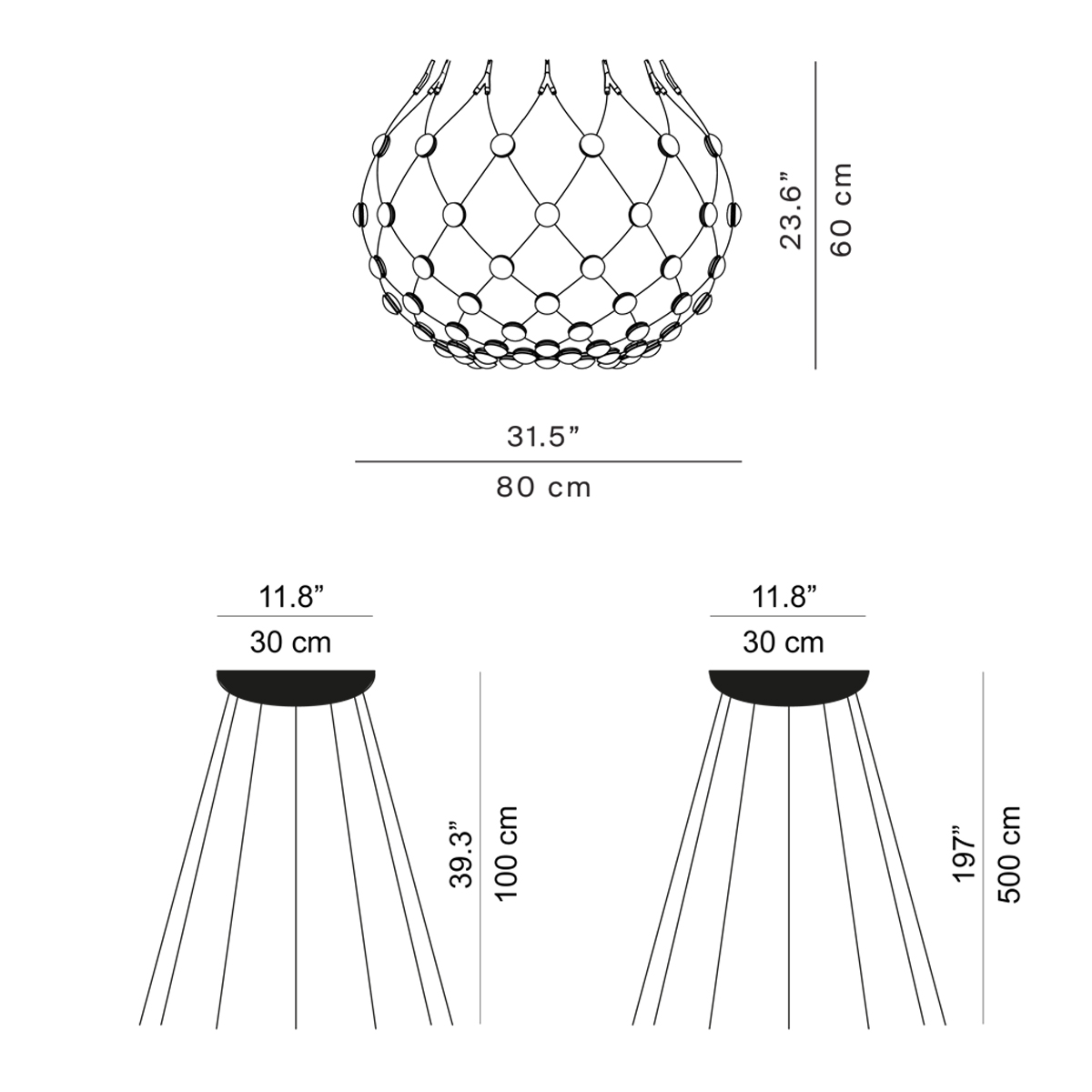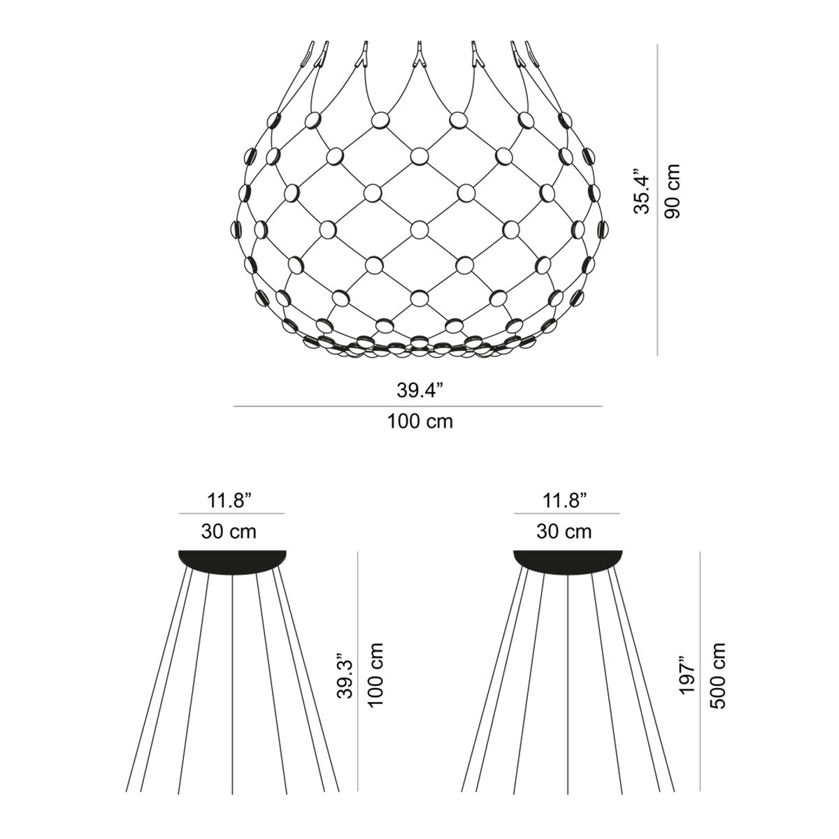Perfekt zur Geltung kommt die netzartige Hängeleuchte über Tischflächen und Theken, aber auch in freier Aufhängung, beispielsweise im Wohnzimmer oder in großzügigen Lounge-Bereichen. Auf Anfrage sind die Produkte auch mit einer Kabellänge von 2, 3 oder 4 Metern erhältlich (preislich identisch zu den 5-m-Ausführungen).