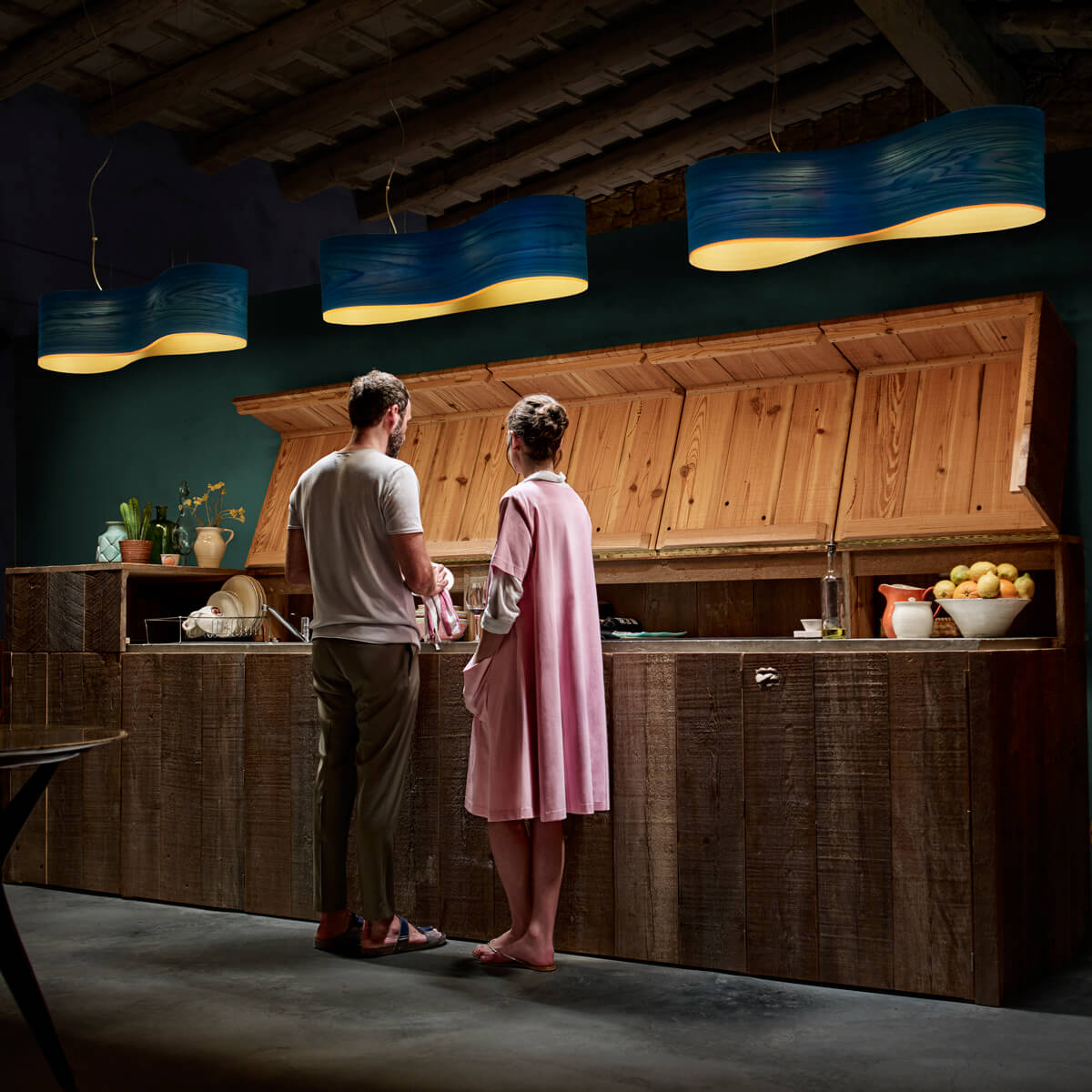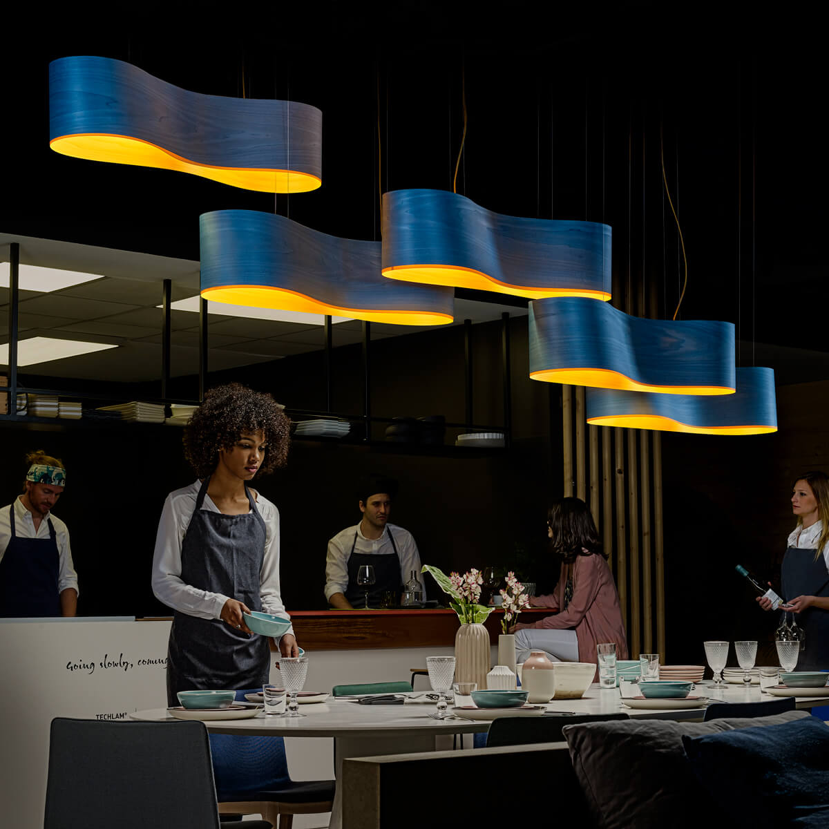 Ideal zur zonierten Beleuchtung über länglichen Esstischen und Theken, schafft die New Wave Pendellampe von LZF Lamps sowohl im privaten Essbereich als auch in der Gastronomie und Hotellerie dekorative Highlights. Ihr zarter, lichtdurchlässiger Holzschirm und die ansprechenden Farbkombinationen verleihen jedem Raum eine warme, einladende Atmosphäre.