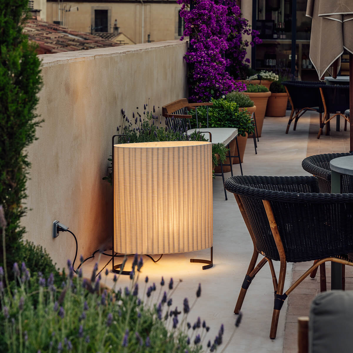 Paravent ähnliche Leuchte, die je nach Größe, sowohl auf dem Boden, Tisch oder gar als Stehleuchte eingesetzt werden kann. Der lichtdurchlässige Schirm aus einem speziellen Anti-UV Gewebe sorgt für ein sanft-warmes Licht und eignet sich dank hoher Schutzart auch im Außenbereich, als Akzentleuchte für laue Sommerabende.