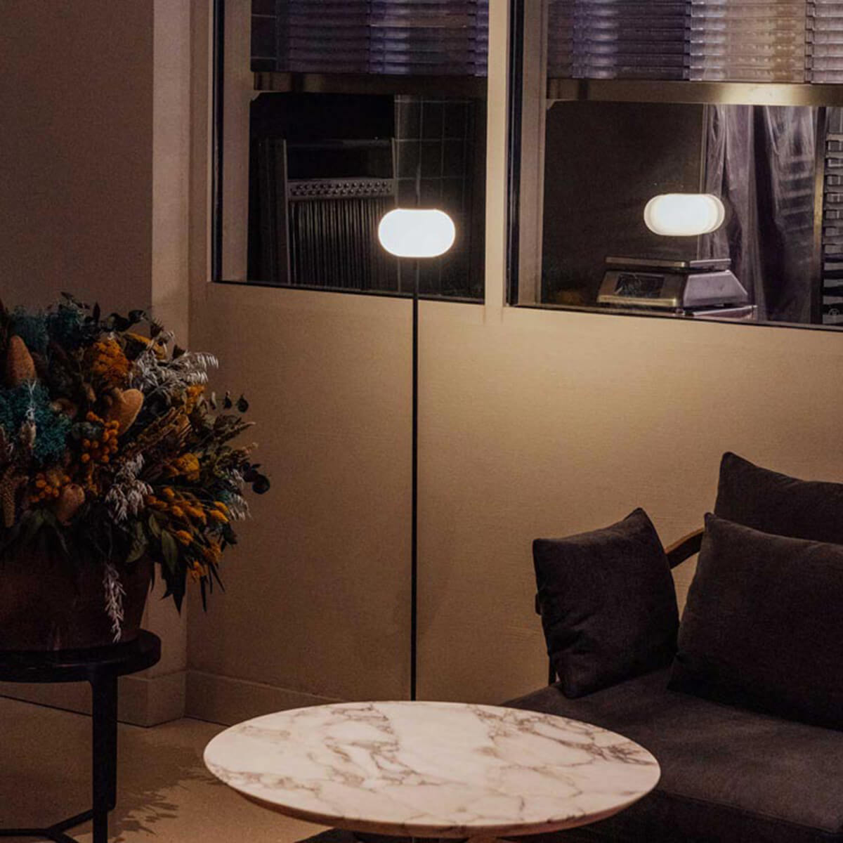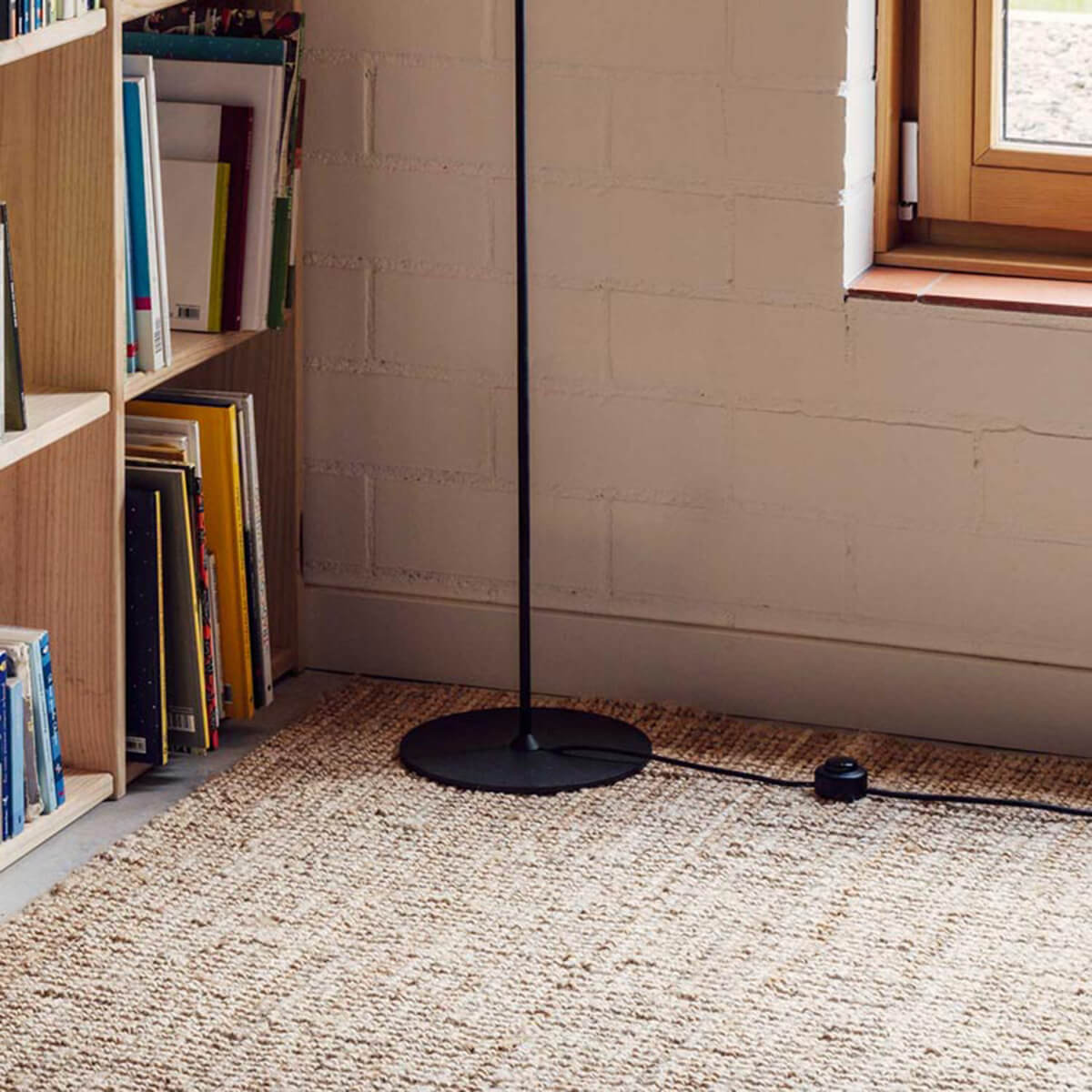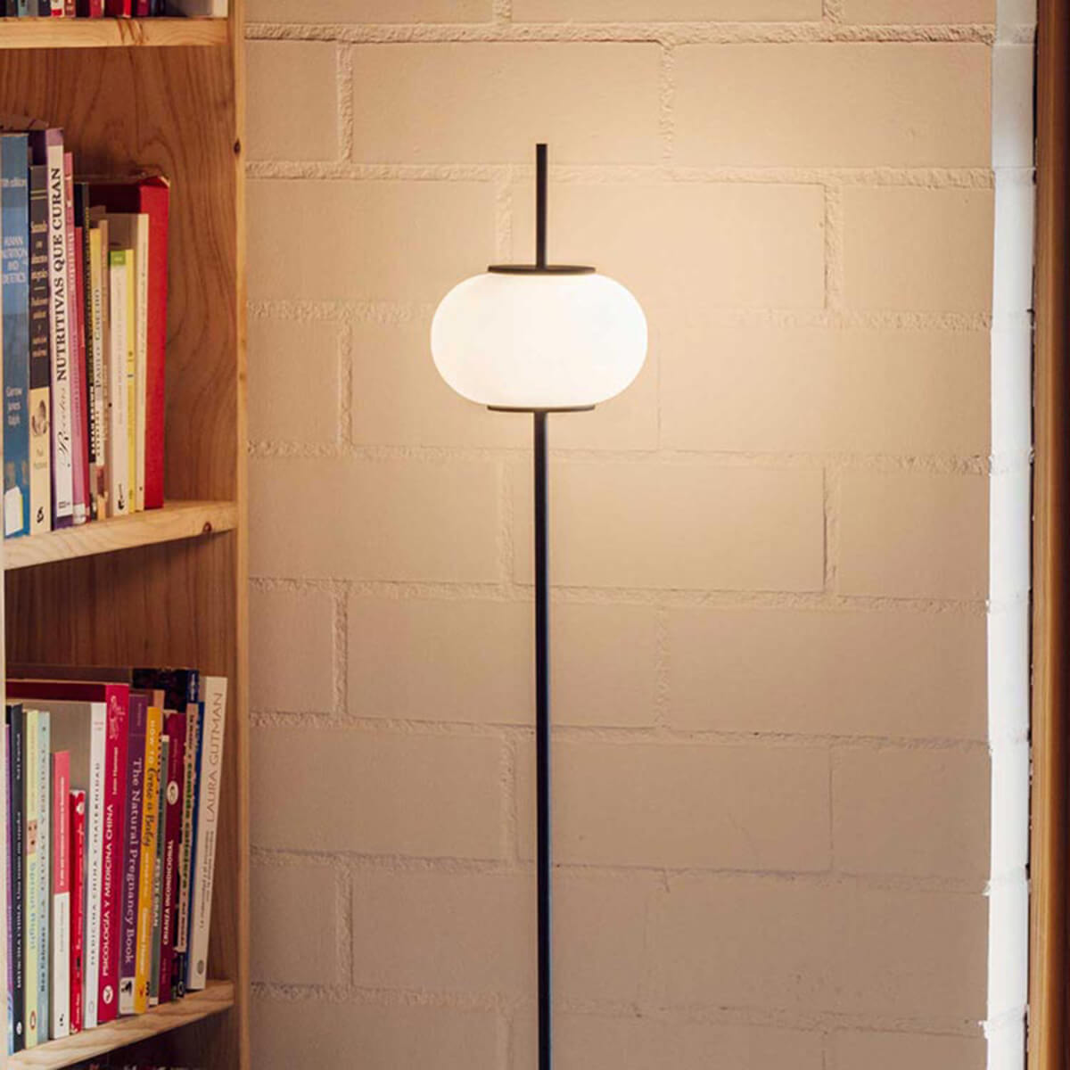 Filigrane Leuchte in schwarz matter Oberfläche mit einem runden Opalglas Diffusor, die Astros Stehleuchte gibt eine gemütliche Atmosphäre in Wohnräumen und ist erhältlich in zwei Größen.