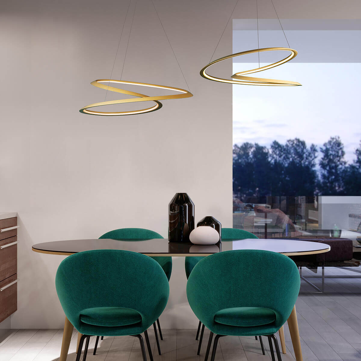 Mit ihrer reduzierten Formsprache passt sich die LED-Pendelleuchte unterschiedlichen Interieurs an – von minimalistisch bis luxuriös. Wählen Sie zwischen tiefem Schwarz, zeitlosem Weiß oder einer edlen Goldlackierung, um gezielt Akzente zu setzen. Die Kabellänge ist bei der Montage flexibel von 2,5 bis 0,4 Meter einstellbar und ermöglicht eine präzise Positionierung – ob als Solitär oder als Ensemble über längeren Tischen.