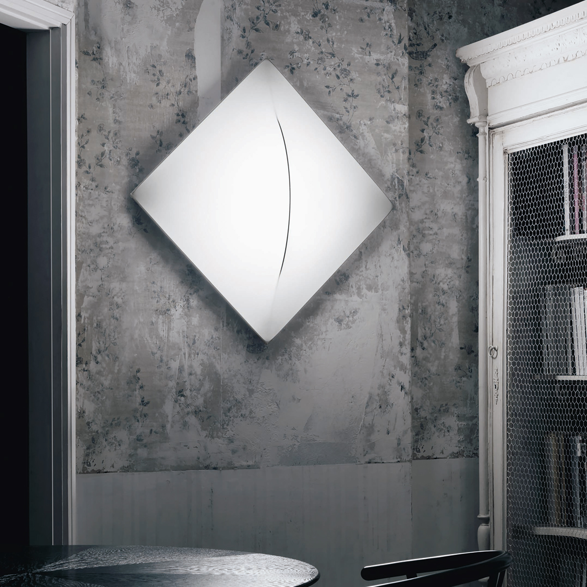 Der besondere Reiz der Nemo Saori Parete: Der Leuchtenkörper besteht aus einer Struktur aus weiß lackiertem Aluminium, über die ein Bezug aus weißem Textilstretch gespannt ist. Dieser fungiert als Leuchtenschirm und gewährleistet eine diffus gestreute Lichtausstrahlung. Ein ästhetisch reizvolles Detail repräsentiert die durch die Metallstruktur erzeugte diagonale Erhebung im Zentrum der Nemo Saori Parete Wandleuchte.