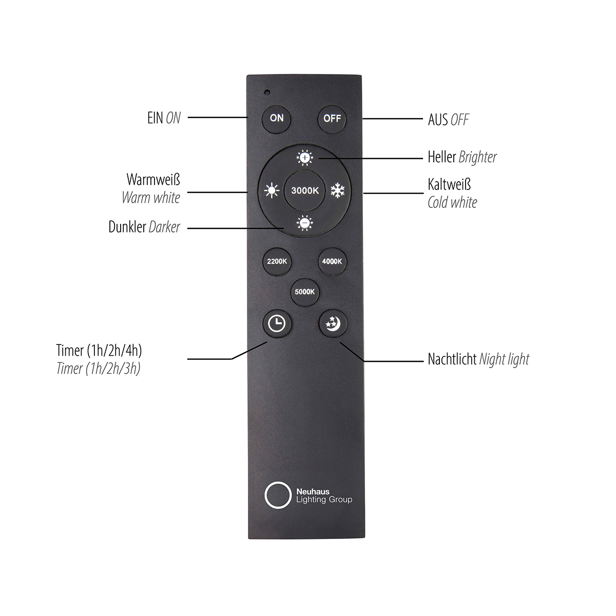 - Ausgestattet mit einer Fernbedienung zur Steuerung von Lichtfarbe (kaltweiß/warmweiß) und Helligkeit