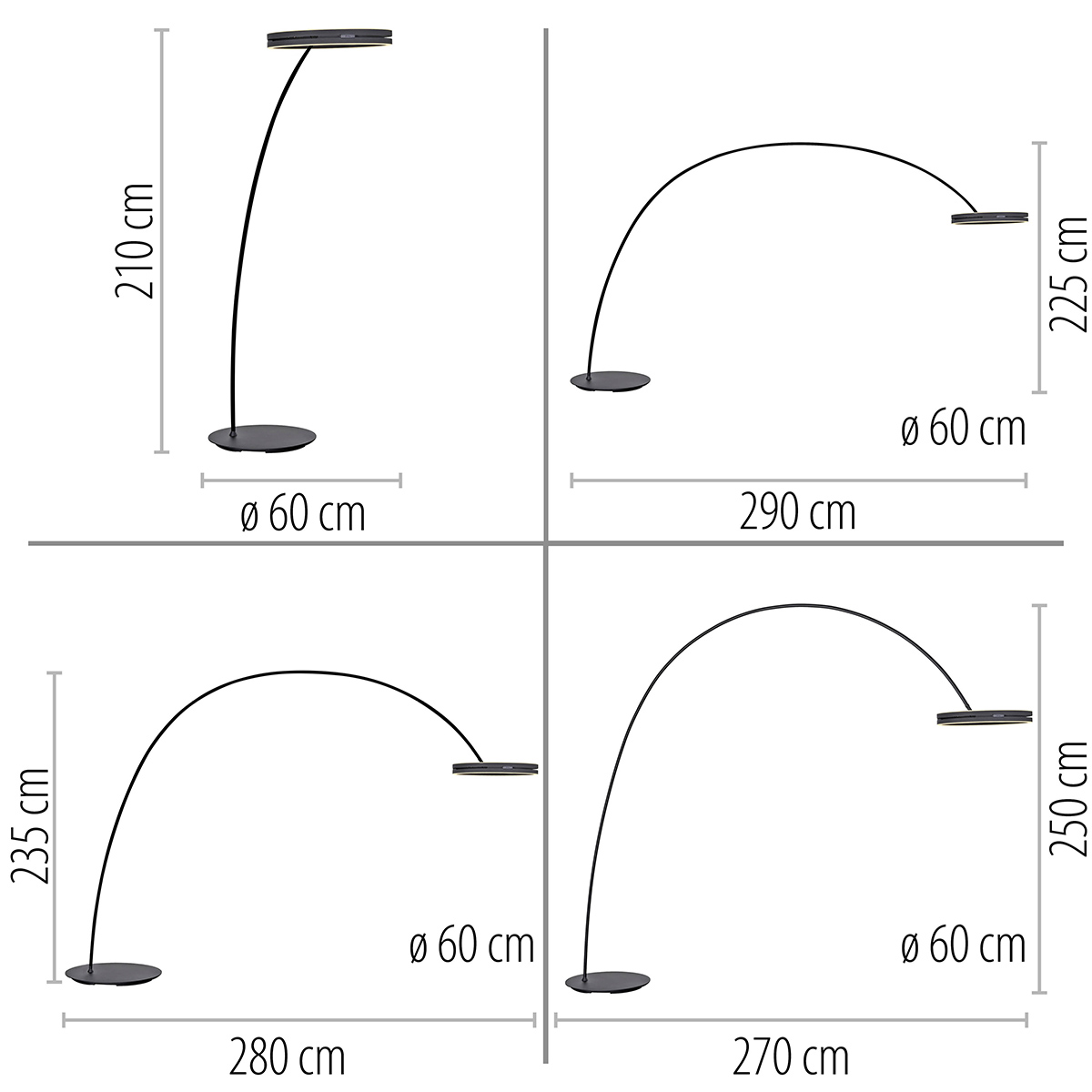 Ein besonderes Highlight ist die variable Bauweise: Bereits vor der Montage lässt sich die Leuchte auf drei unterschiedliche Höhen einstellen. Zusätzlich kann sie wahlweise als Bogen- oder als gerade Stehleuchte eingesetzt werden. Die großzügige Kabellänge von 200 cm ermöglicht dabei eine flexible Positionierung im Raum.