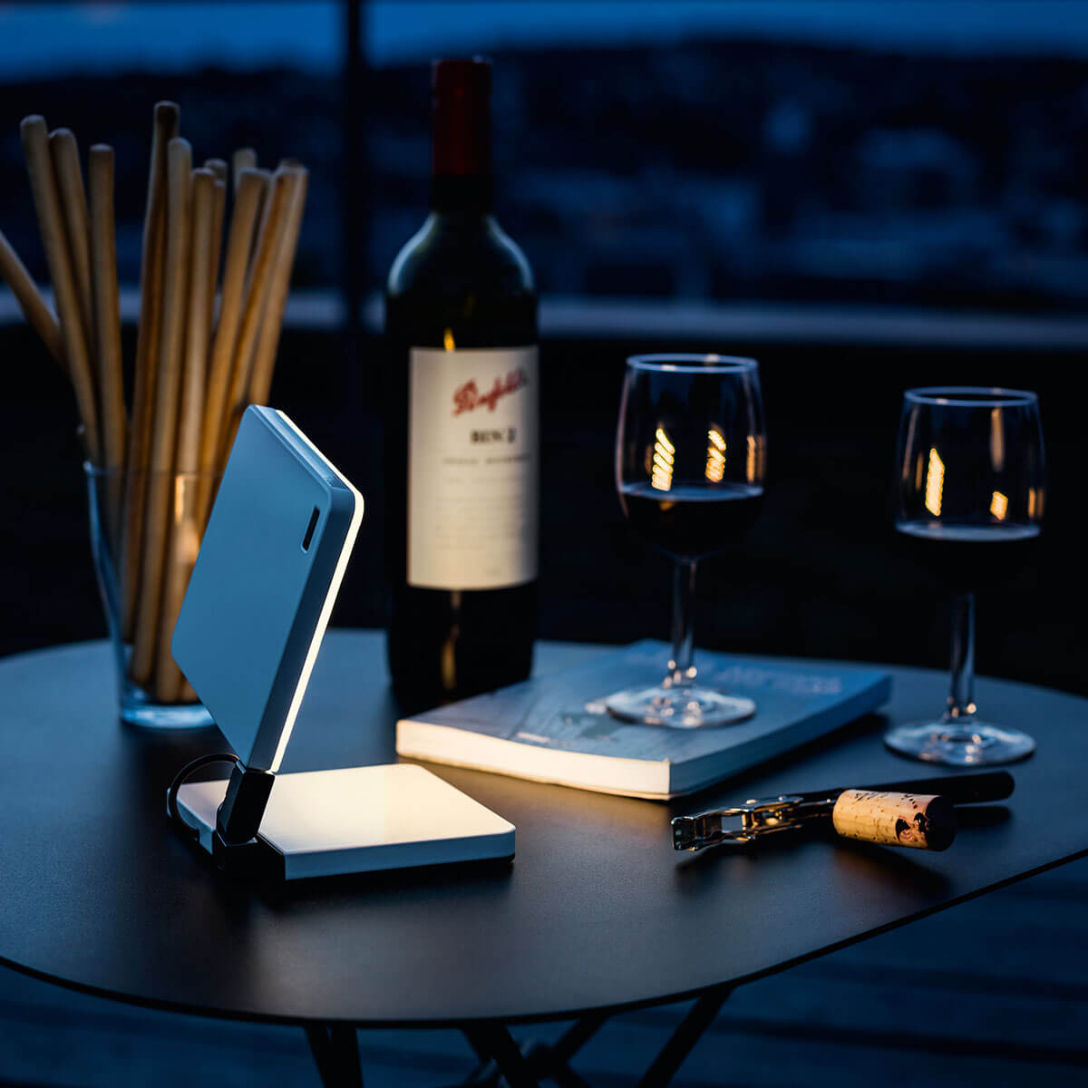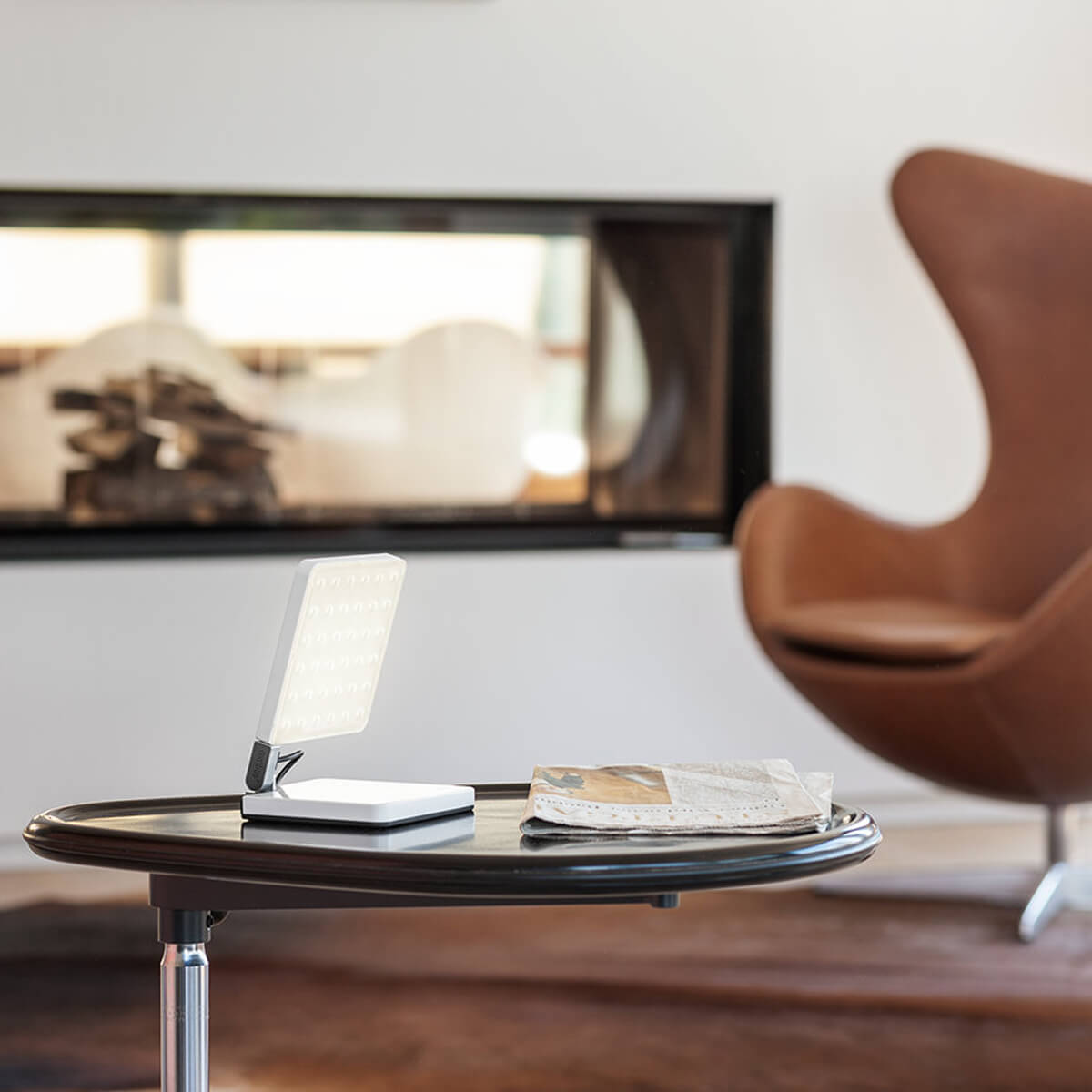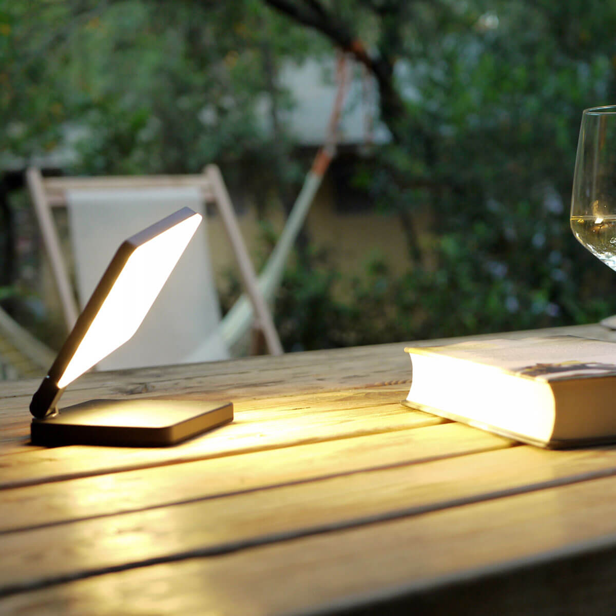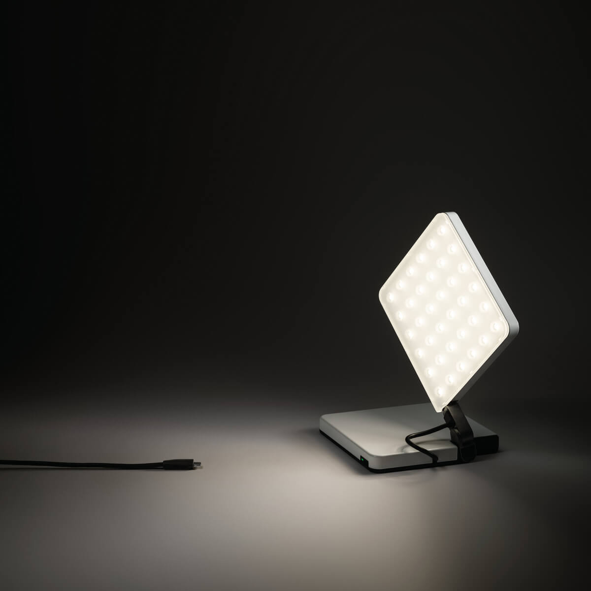 Ein Spotlight-Diffusor aus Polycarbonat sorgt für eine homogene, blendfreie Ausleuchtung. Mit rund 400 Lumen liefert die kleine Akku-Tischleuchte ein komfortables Leselicht in einem warmweißen Ton von 2.700 Kelvin – perfekt für entspannte Abendstunden.