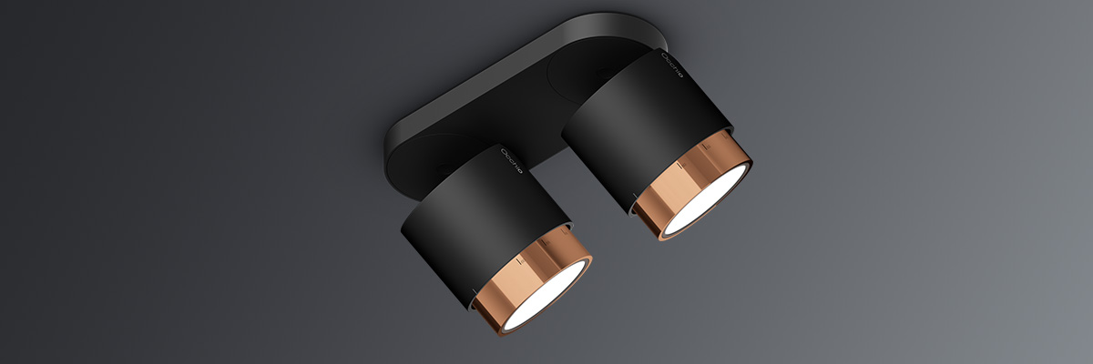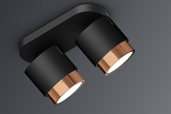 Wenn Sie beim Blick auf den zweiflammigen Deckenspot an die Objektive von Fotokameras denken, liegen Sie richtig. Daran orientierten sich Axel Meise und Christoph Kügler, als sie die hochfunktionale Strahlerserie entwarfen. Für die Applikation der Leuchtenköpfe am Baldachin entwickelte die Marke ein ausgeklügeltes 3d-Gelenk. Die beiden Lichtspender lassen sich dadurch um 360° drehen und um 45° schwenken. Das beschert Ihnen eine bemerkenswerte Freiheit bei der präzisen Lichtausrichtung.