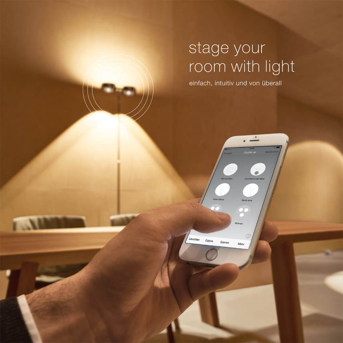 - Schalt- und dimmbar mittels Occhio air App bzw. Occhio air Controller oder berührungslos via "touchless control" (Gestensteuerung im Kopf)